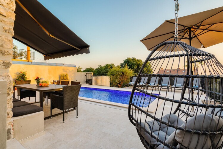 Salle de séjour(canapé-lit double, TV, table, coin salon), cuisine ouverte(grille-pain, cafetière/percolateur, four, micro ondes, lave-vaisselle , combinaison réfrigérateur/congélateur, lavabo, ), chambre(lit double, TV), chambre(lit double, TV), salle de bains(douche, lavabo, WC), Accès Internet, Meubles de jardin, lave-linge , terrasse, jardin, parking, piscine(privé), fer à repasser, sèche-cheveux