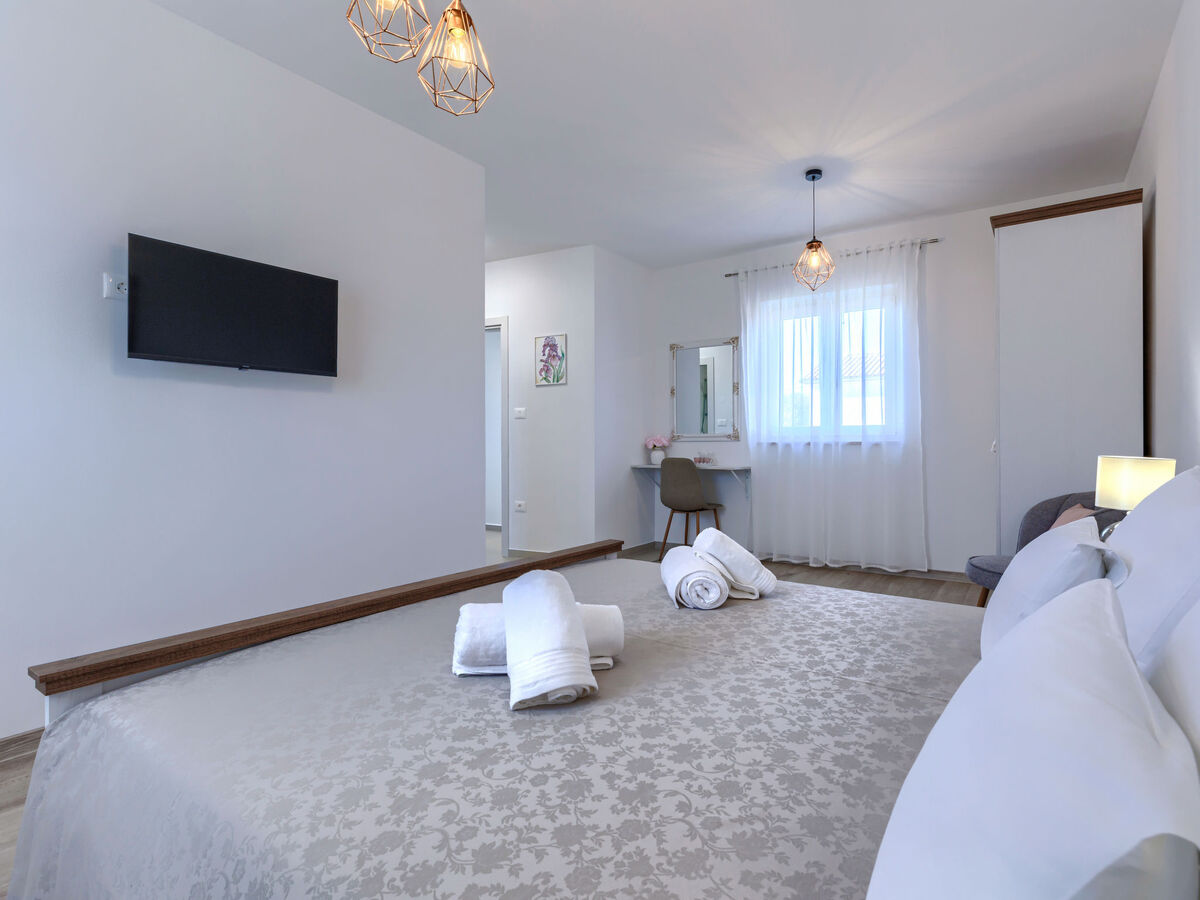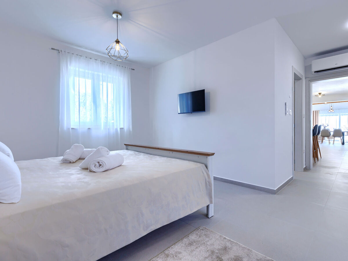 À l'étage supérieur: 2 chambres, chaque chambre avec: 1 grand-lit (180 cm, longueur 200 cm), douche/WC et air-conditionné.