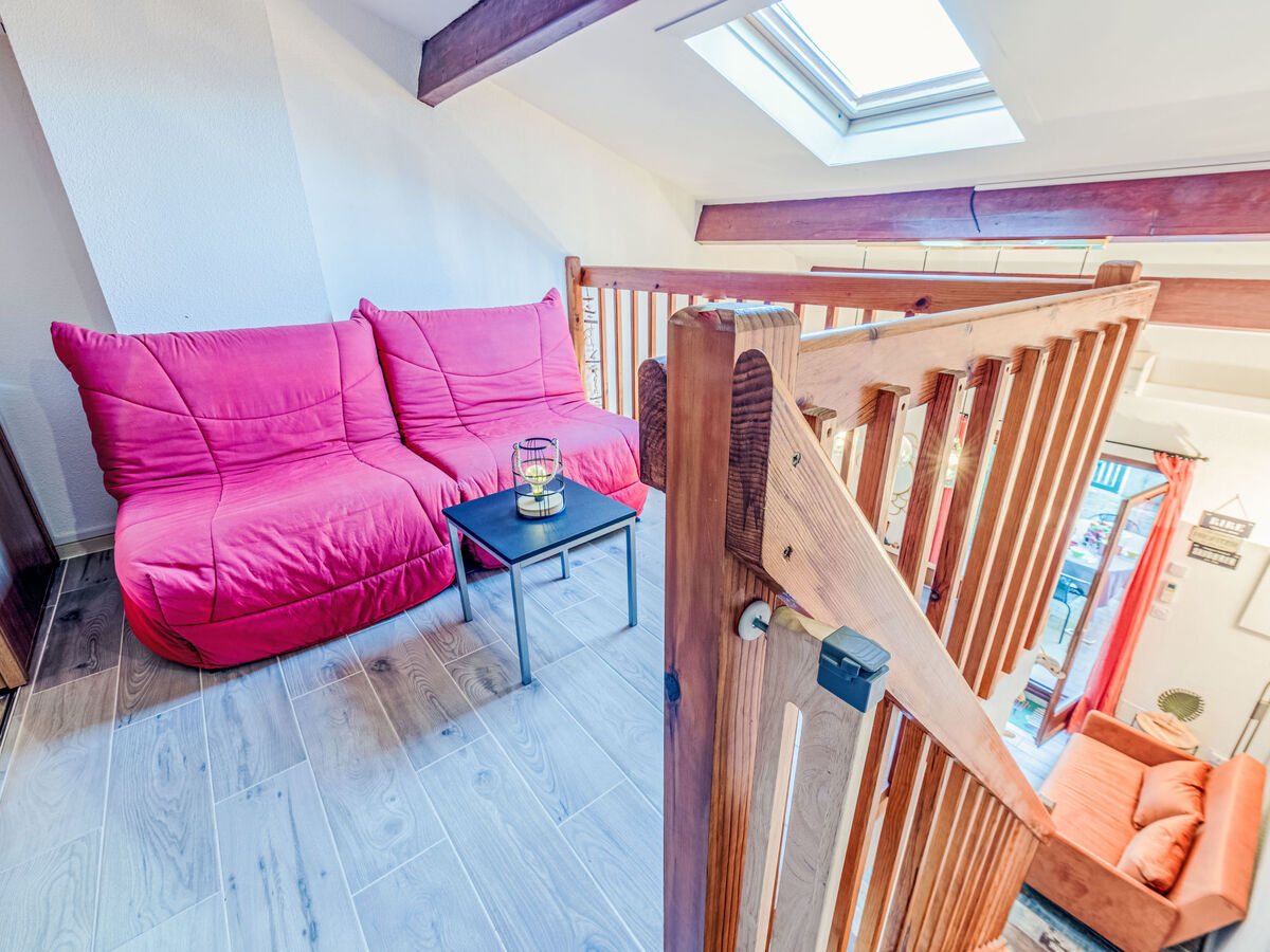 À l'étage supérieur: galerie mansardée, hauteur plafond 165 - 216 cm.