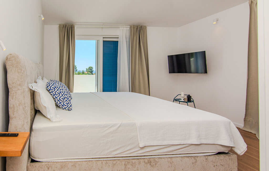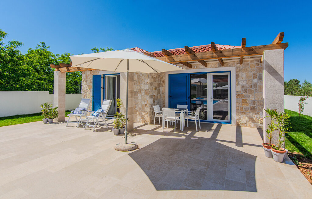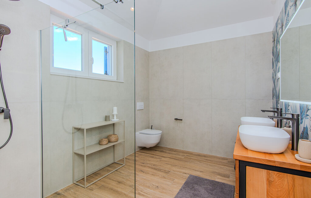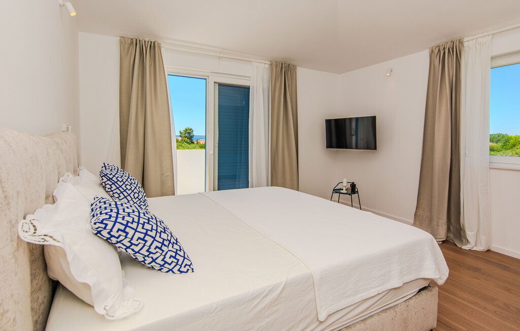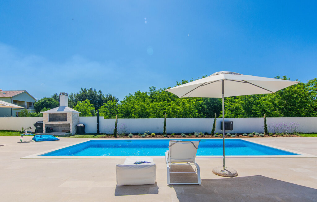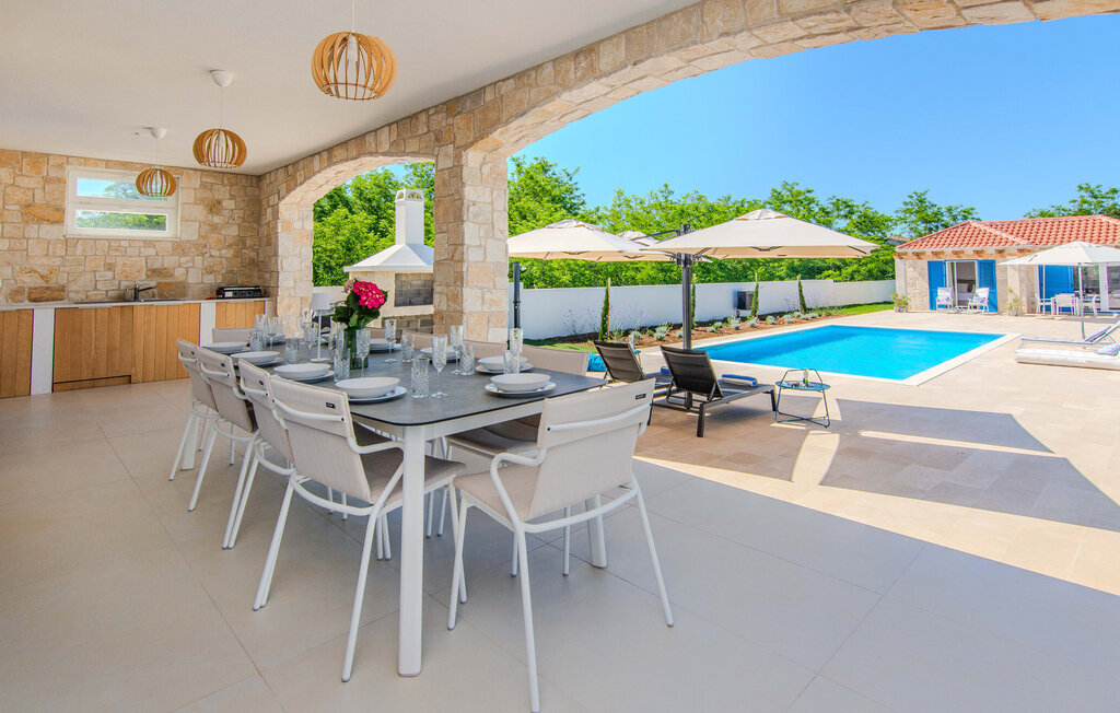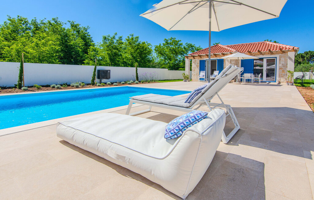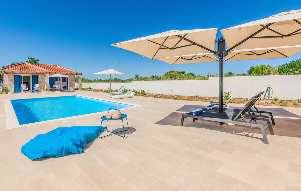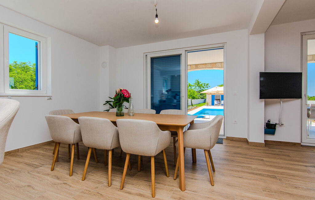 Plongez dans la grande piscine et détendez-vous sur les chaises longues confortables ou prenez votre petit-déjeuner dans l'espace extérieur couvert avec vue sur le paysage méditerranéen. La façade en pierre décorée avec goût et les volets caractéristiques confèrent à la maison un charmant caractère dalmate. Le trampoline dans le jardin permet aux petits vacanciers de sauter de manière amusante.