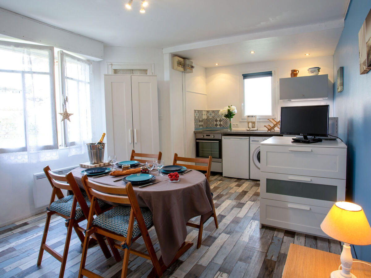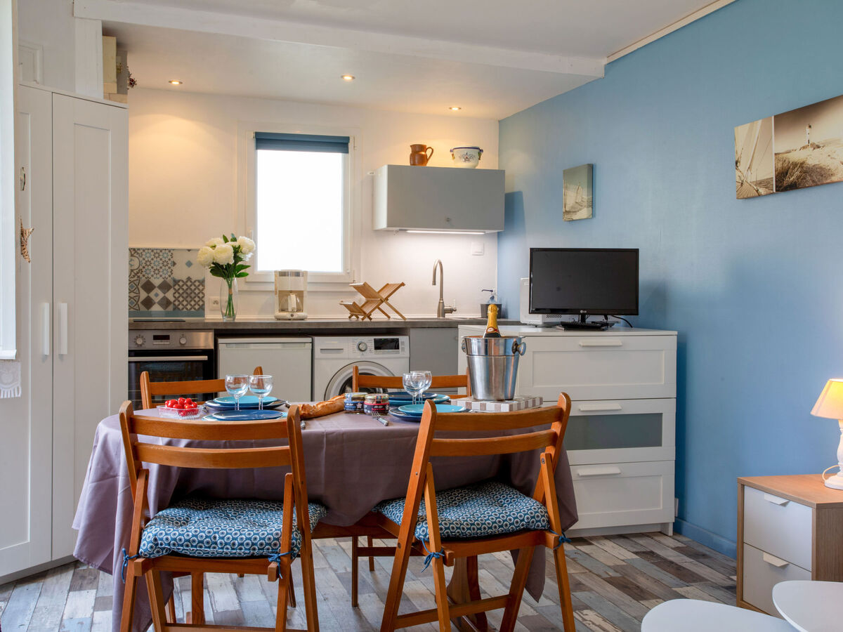 Aménagement simple et plaisant: séjour/salle à manger avec 1 divan-lit (140 cm, longueur 190 cm), TV (écran plat).