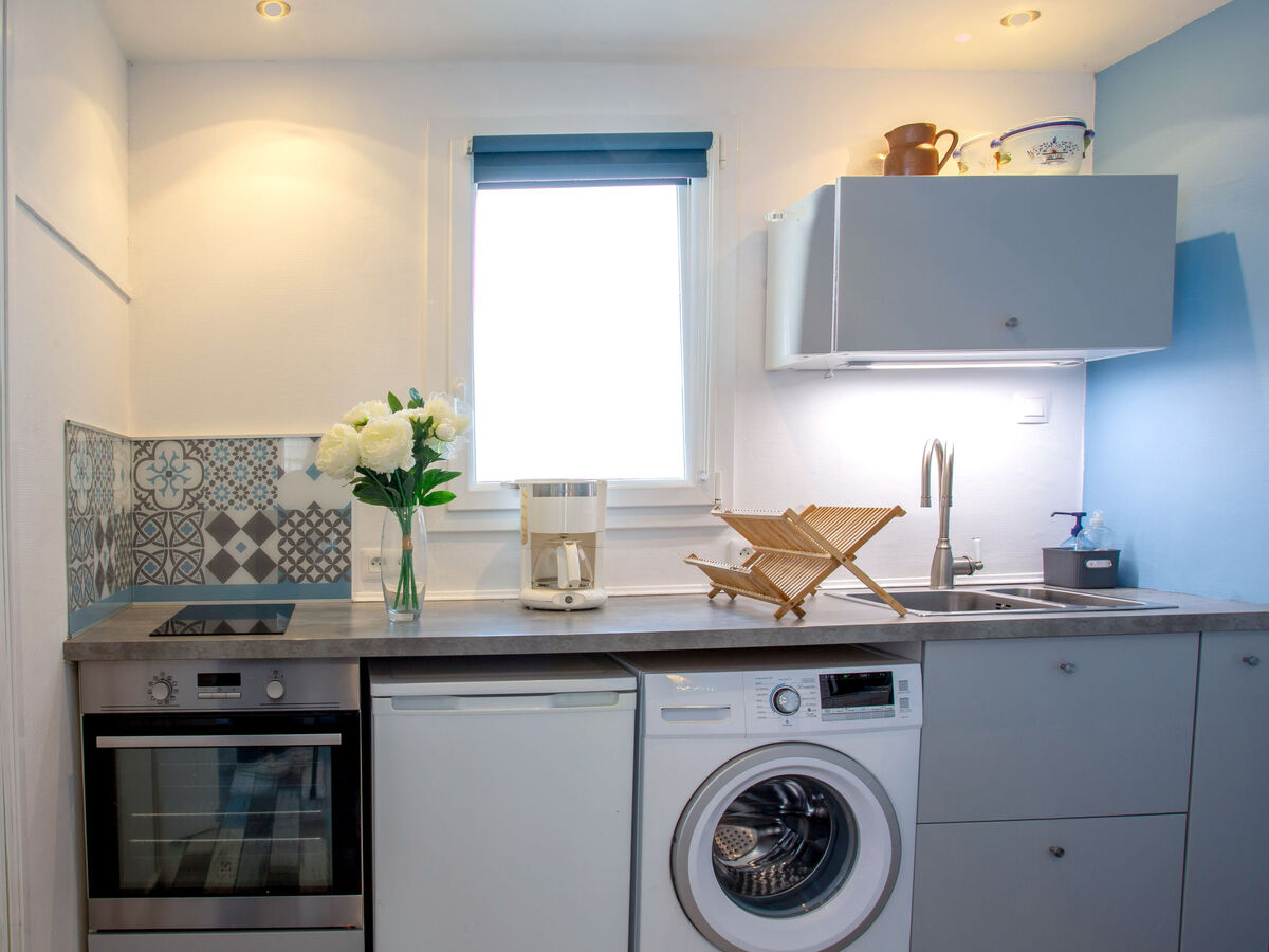 Cuisine ouverte (four, 2 plaques vitrocéramiques, grille-pain, bouilloire électrique, micro-ondes, cafetière électrique).