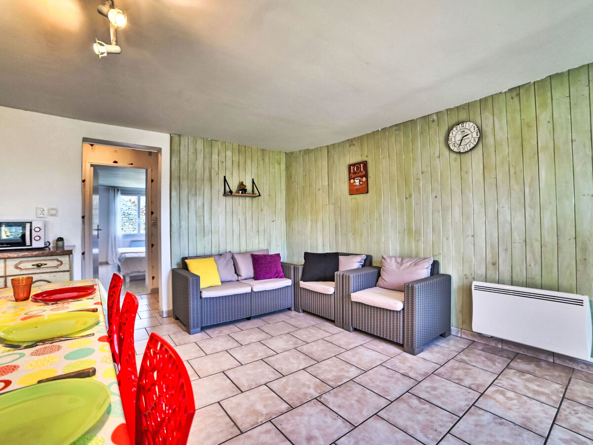 Aménagement simple: séjour/salle à manger avec TV (écran plat).