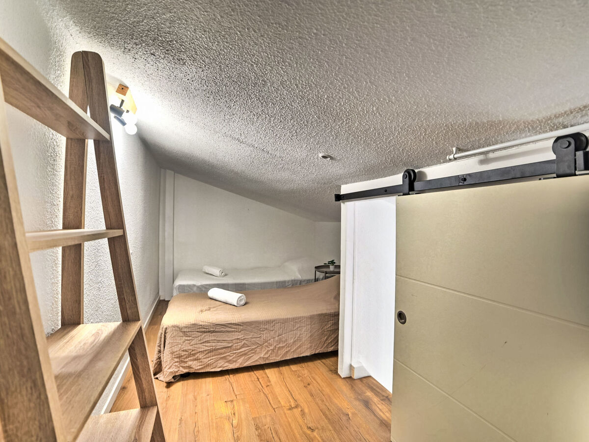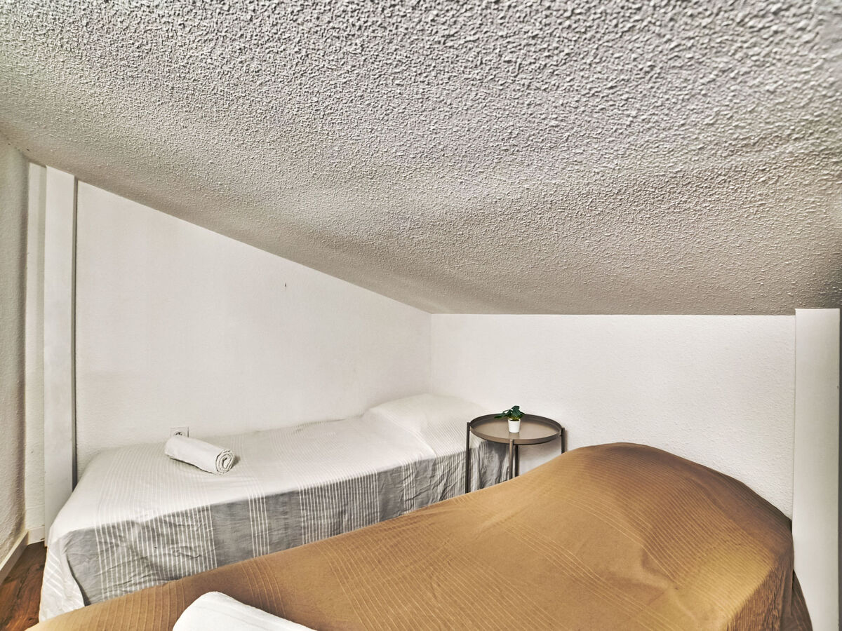 À l'étage supérieur: 1 chambre, sans fenêtre avec 2 lits (80 cm, longueur 190 cm).