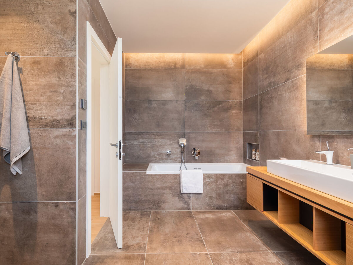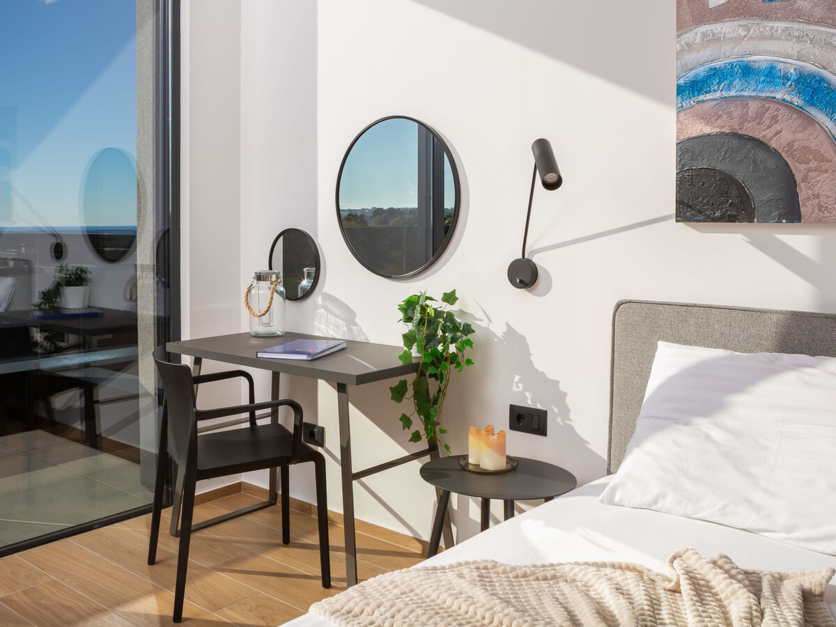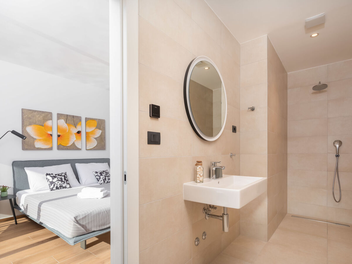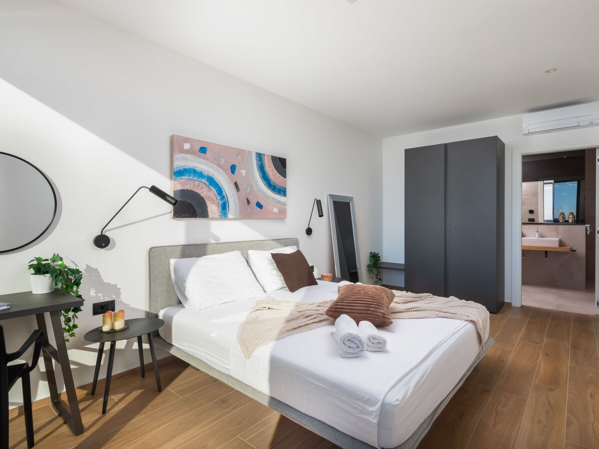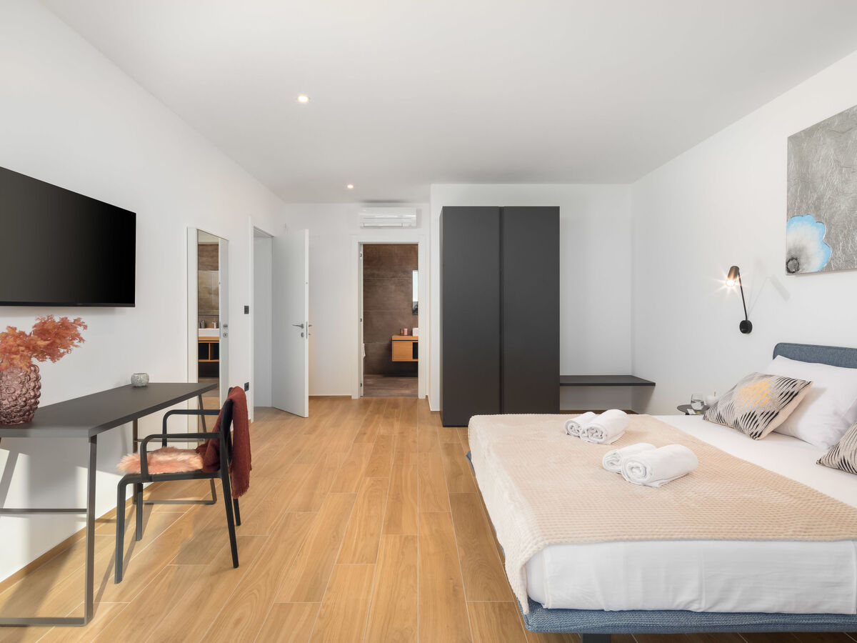 1 chambre 28 m2 avec 1 grand-lit (180 cm, longueur 200 cm), bain/douche/WC, double vasque, TV (satellite) et air-conditionné.
