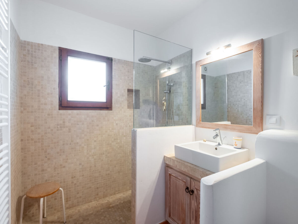 Douche extérieure, terrasse, meubles de jardin, place de parking (couvert) sur le terrain.