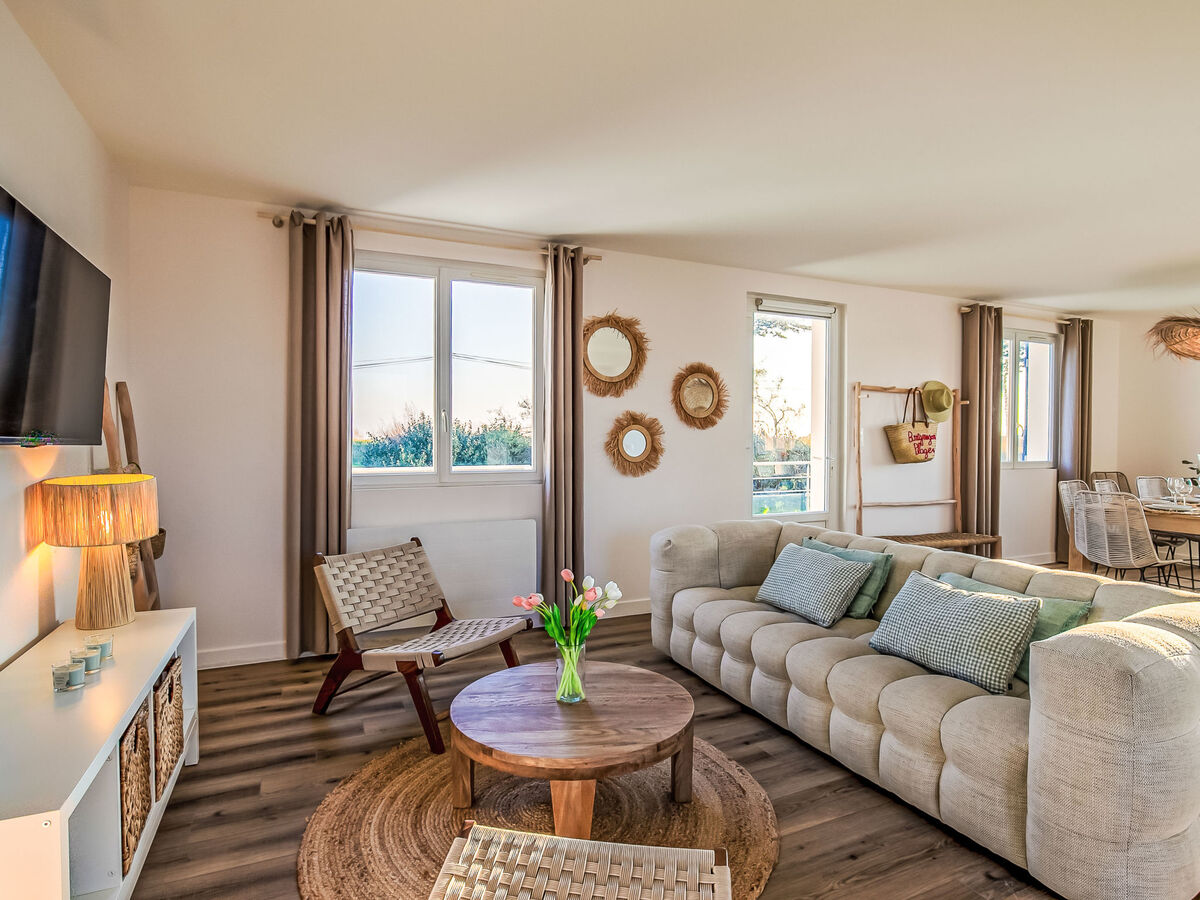 Clair, complètement rénovée en 2023, aménagement moderne et de bon goût: séjour/salle à manger avec TV (écran plat).