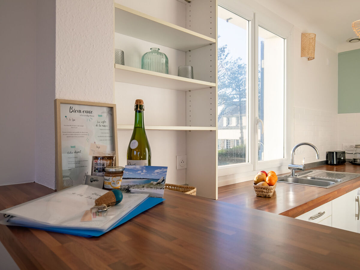 Cuisine ouverte 10 m2 (four, lave-vaisselle, 4 feux, grille-pain, bouilloire électrique, micro-ondes, congélateur, cafetière électrique) avec bar.
