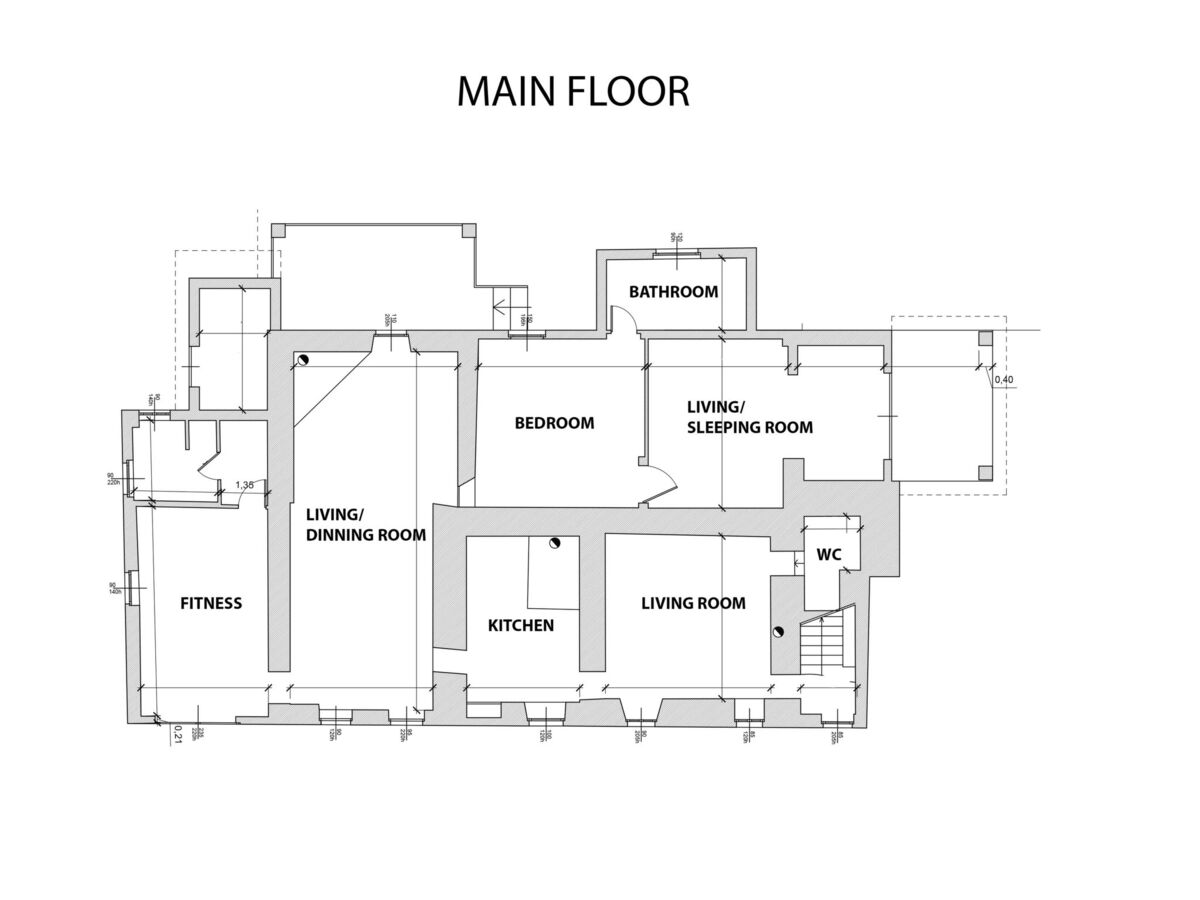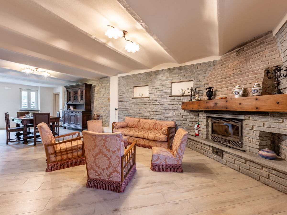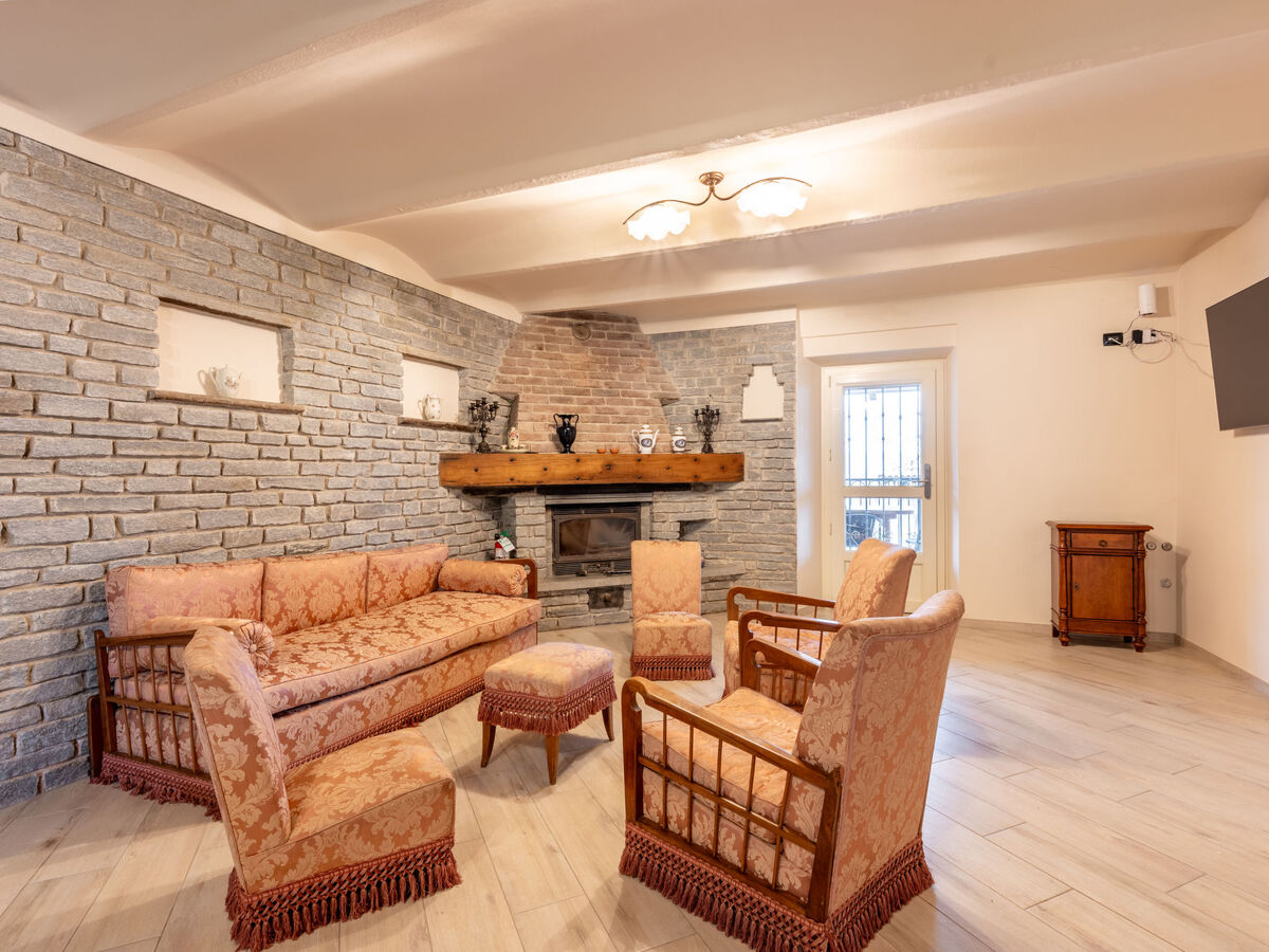 Salon avec cheminée, WC séparés et TV.