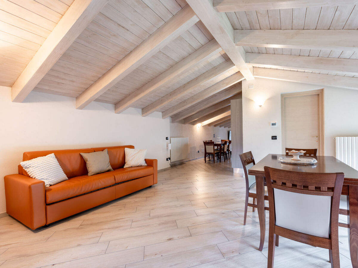 Sous le toit: (escalier en colimaçon) séjour/salle à manger avec 2 divans-lits doubles, cheminée, table pour les repas et TV.