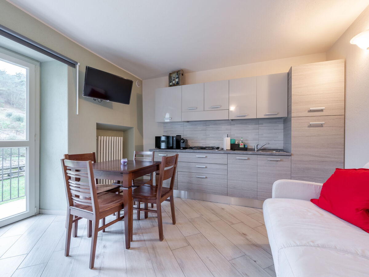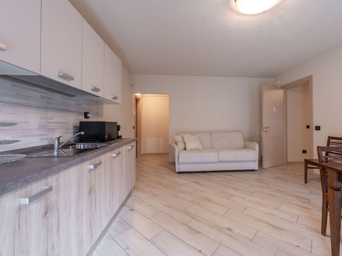 Séjour/chambre à coucher avec 1 divan-lit double, table pour les repas, coin-cuisine et TV.