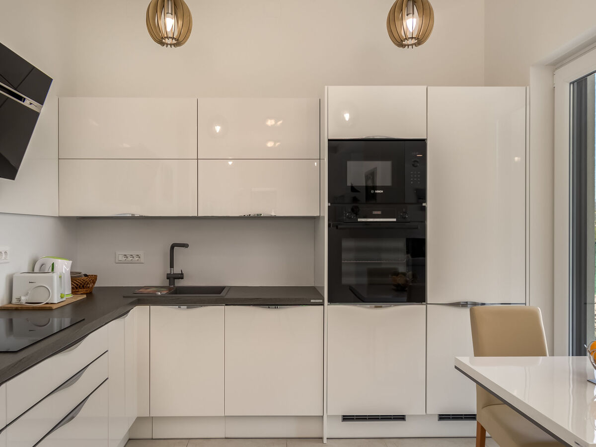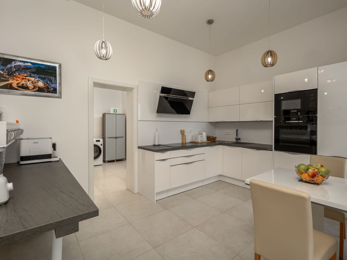 Cuisine ouverte (four, lave-vaisselle, 4 plaques à induction, bouilloire électrique, congélateur, cafetière électrique).