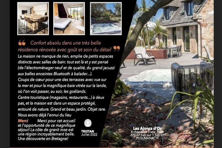 La villa des ajoncs d'or est une propriété de charme à louer pour les vacances. Située dans une charmante localité de Bretagne. Son point fort est sa situation en bord de mer et de plage, avec un accès direct aux chemins de randonnées. C'est une belle villa au style moderne et aux équipements de standing, notamment un jacuzzi extérieur sans vis à vis. Elle est conçue pour accueillir 10 personnes.