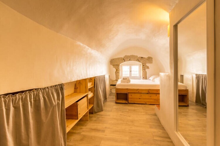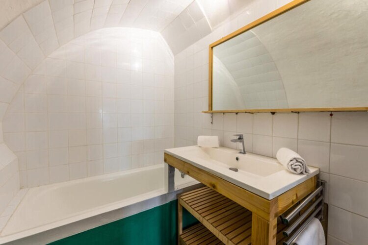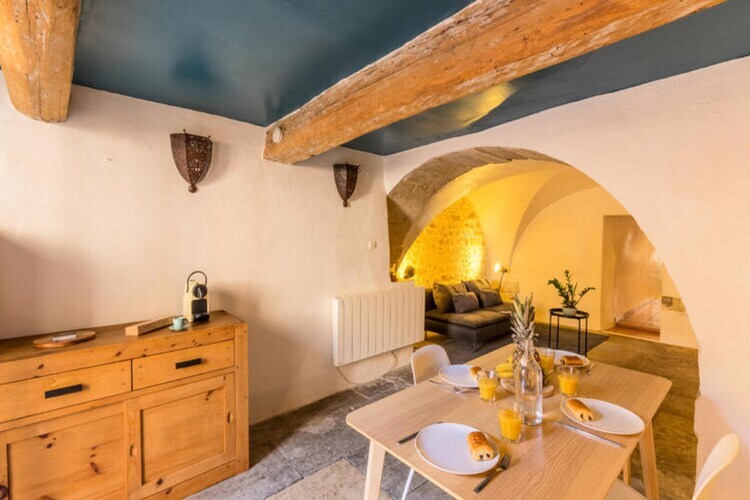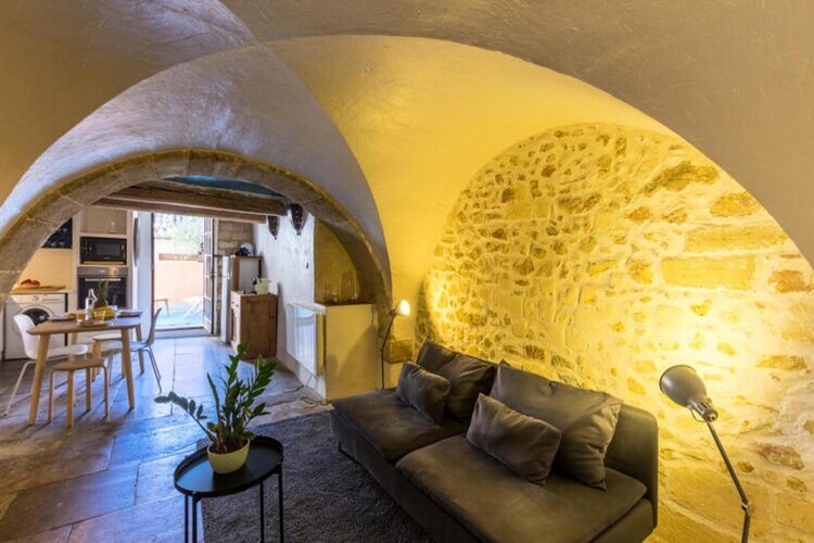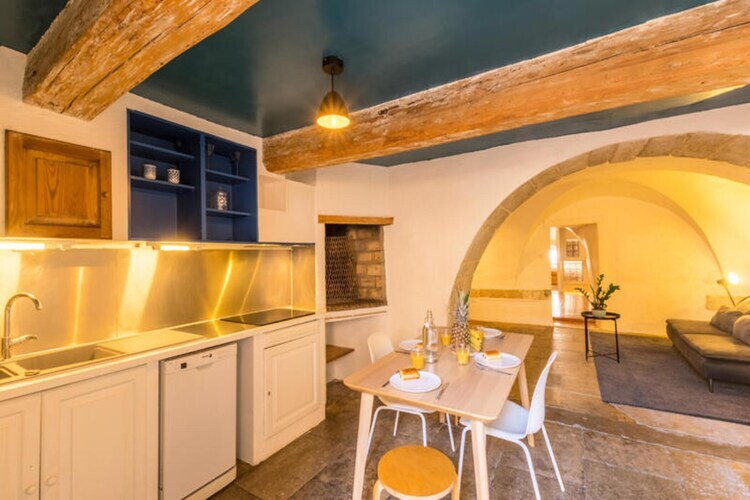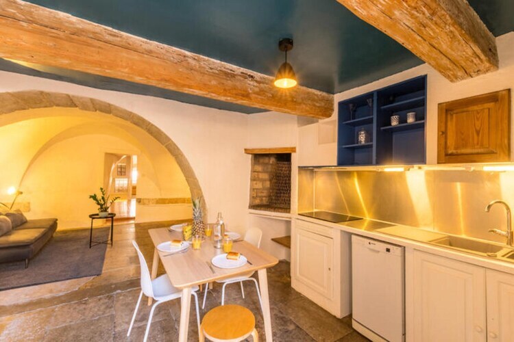 Cet appartement offre un cadre unique avec ses plafonds voûtés anciens, ses pierres apparentes et ses barres au sol typiques de Montpellier dans la cuisine et le salon.