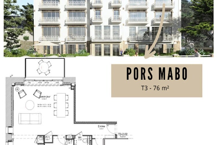 «Pors Mabo» vous offre un cadre de vie exceptionnel avec ses espaces extérieurs magnifiques et son intérieur confortable. Détendez-vous sur le balcon face à la mer. À l'intérieur, le séjour lumineux de 35 m2 constitue l'endroit idéal pour se retrouver en famille ou entre amis après une journée d'exploration. L'appartement bénéficie de 2 suites parentales avec dressing et salle d'eau privative, garantissant un confort optimal.
