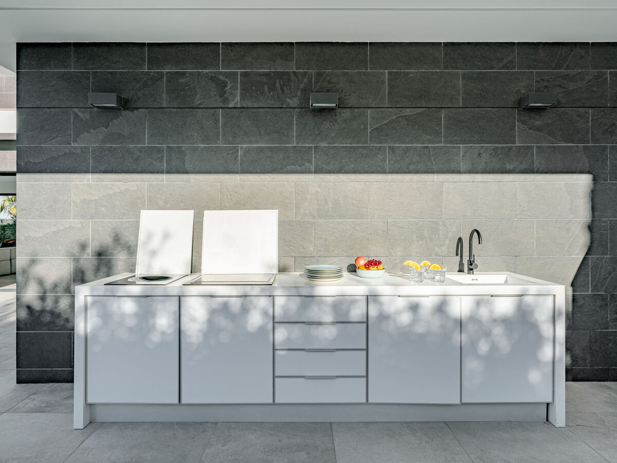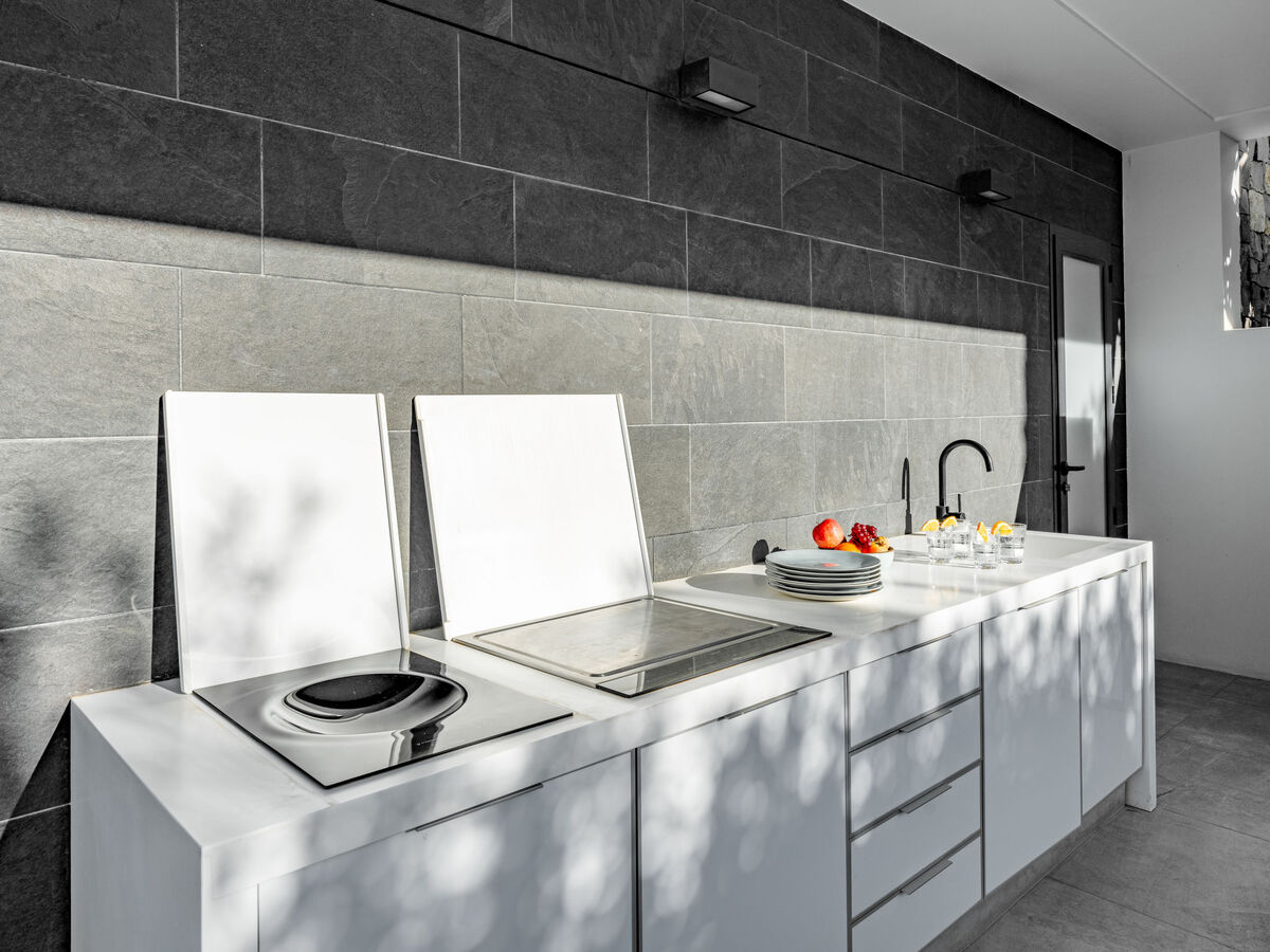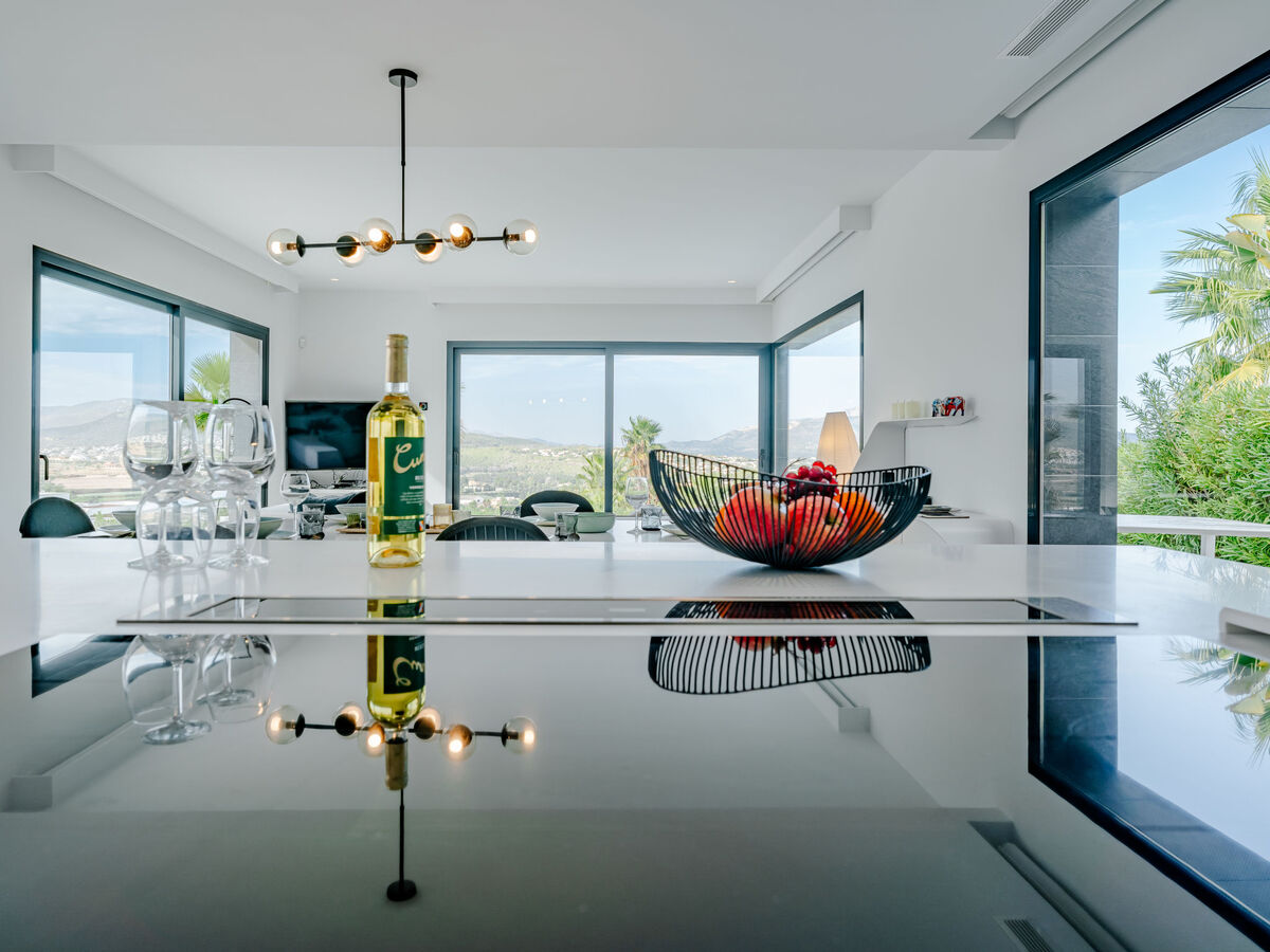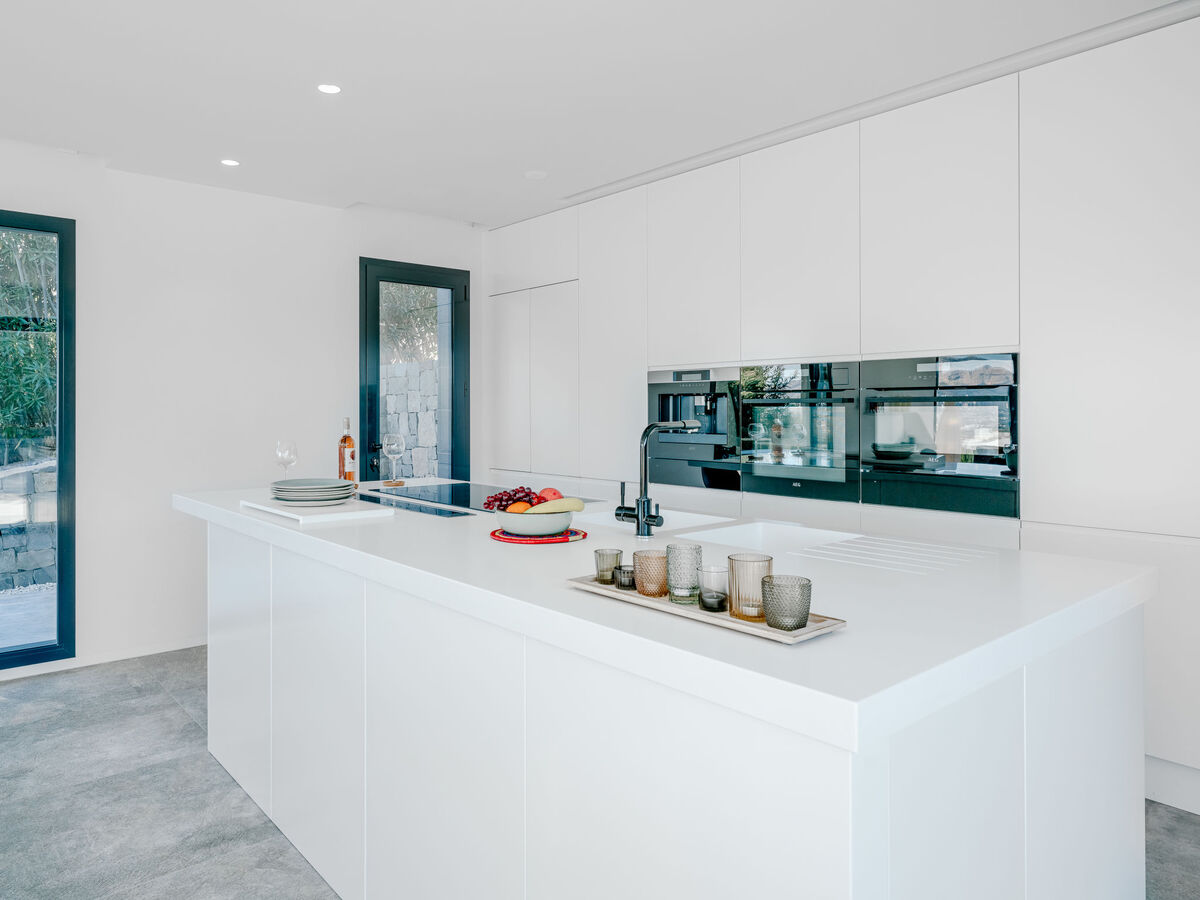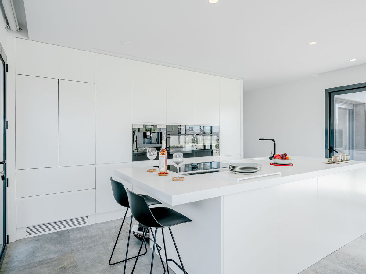 Grande cuisine ouverte (four, lave-vaisselle, 5 plaques à induction, grille-pain, bouilloire électrique, micro-ondes, congélateur, cafetière électrique, ilot de cuisine, combiné micro-ondes) avec table pour les repas, air-conditionné et chauffage à air chaud.
