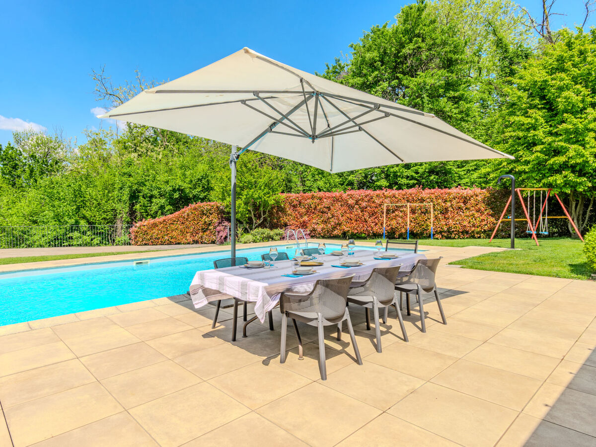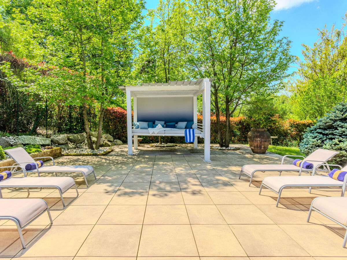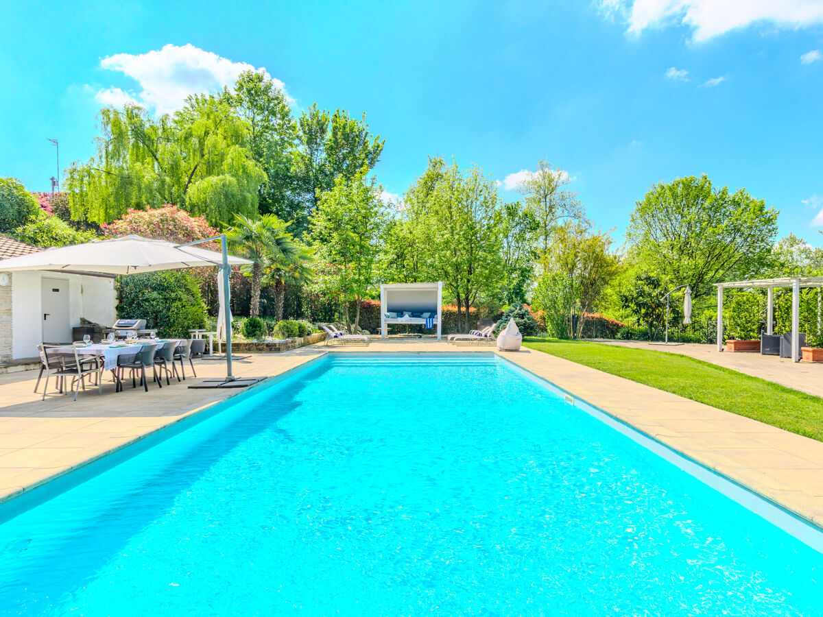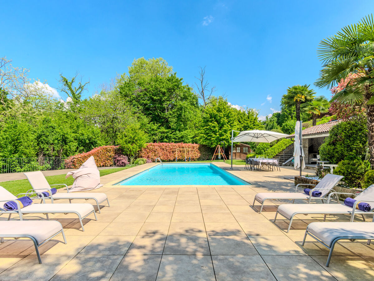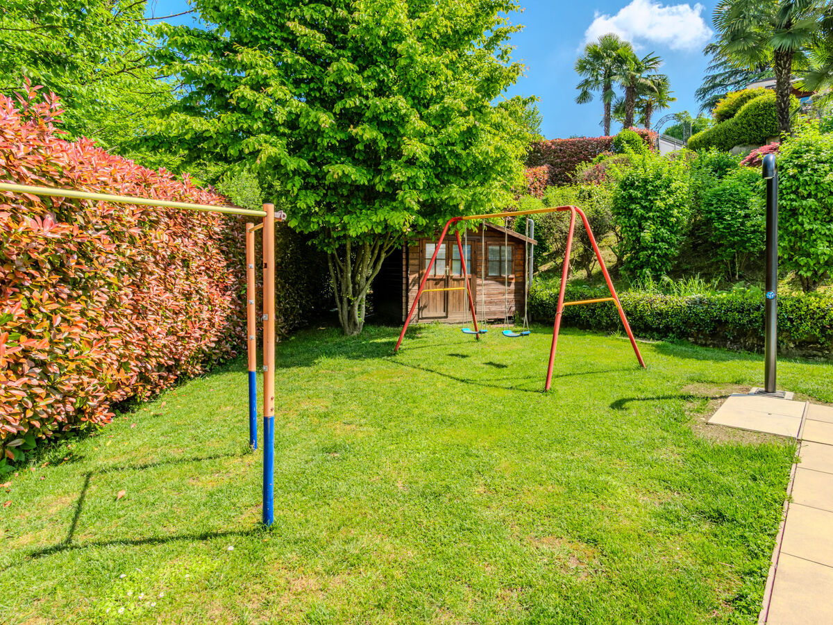 A usage privé: grand jardin sur plusieurs niveaux avec pelouse et arbres, piscine rectangulaire (disponibilité saisonnière: 01.Avr.