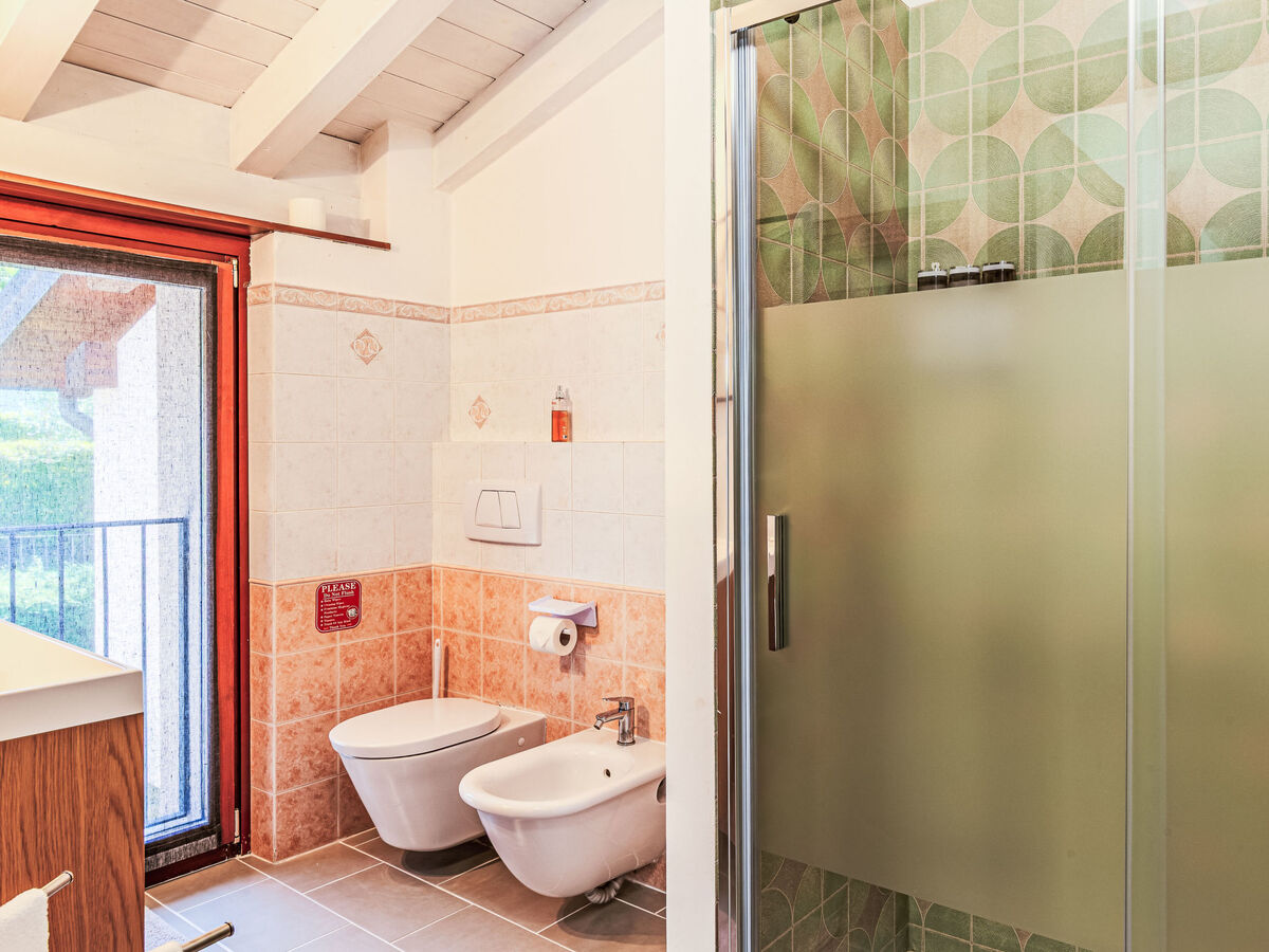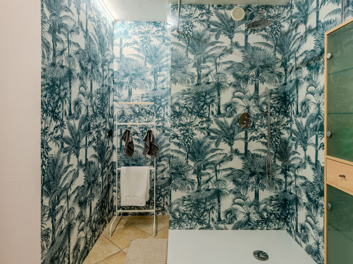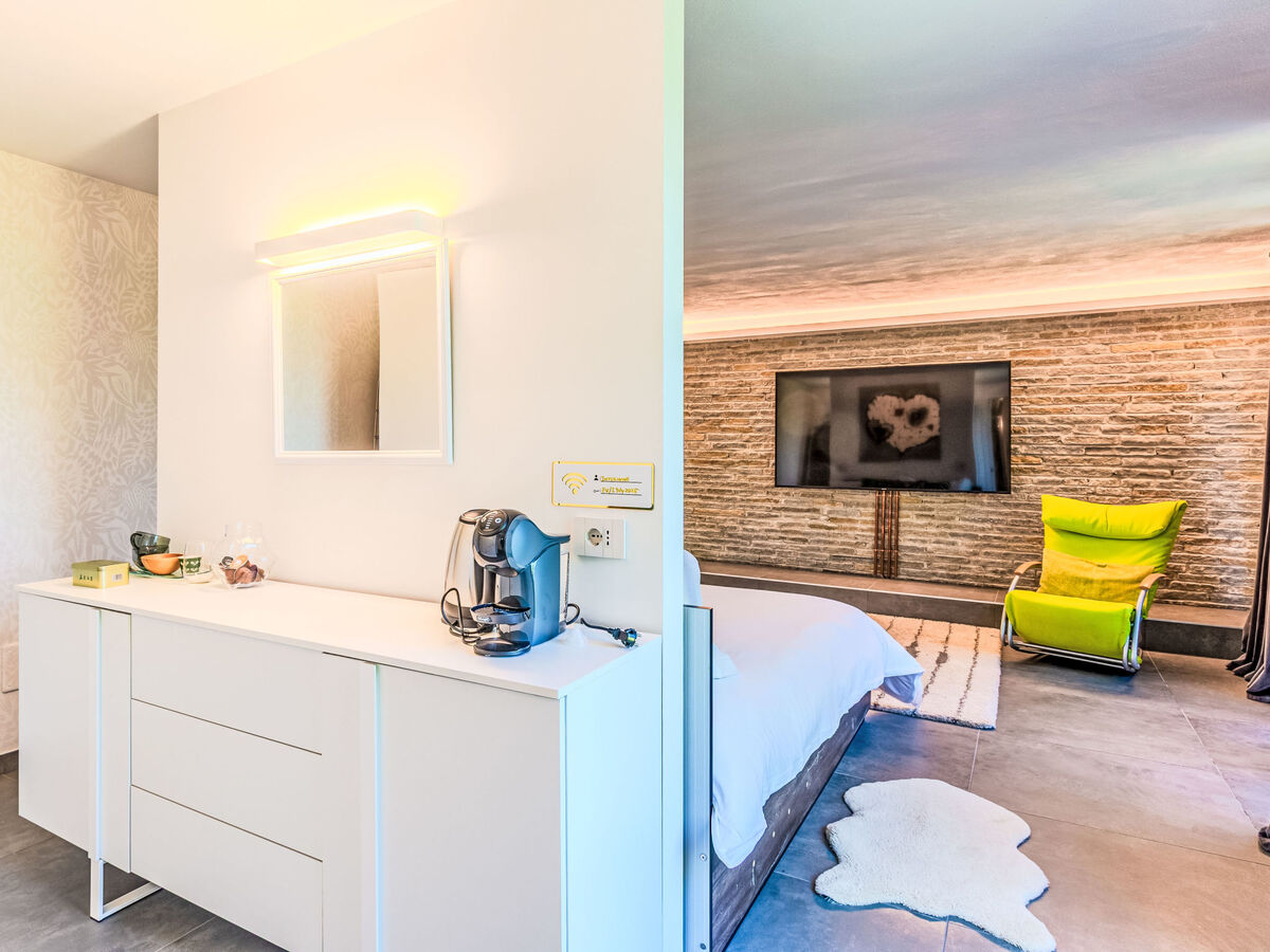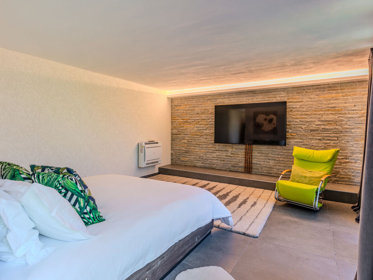 À l'étage inférieur: (escalier extérieur) 1 grande chambre avec 1 lit, 1 lit double, douche/bidet/WC et TV.