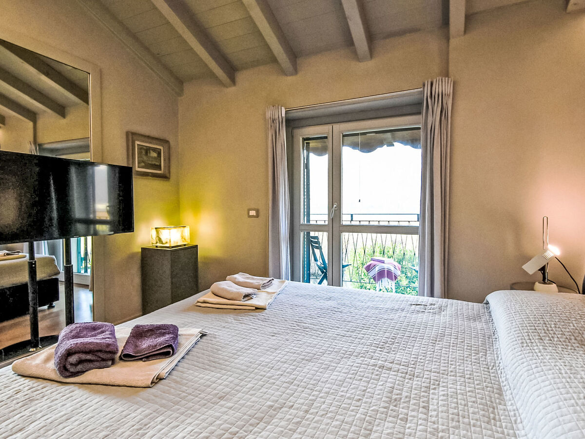 1 grande chambre mansardée avec baie vitrée avec 1 lit double (160 cm, longueur 200 cm), TV.