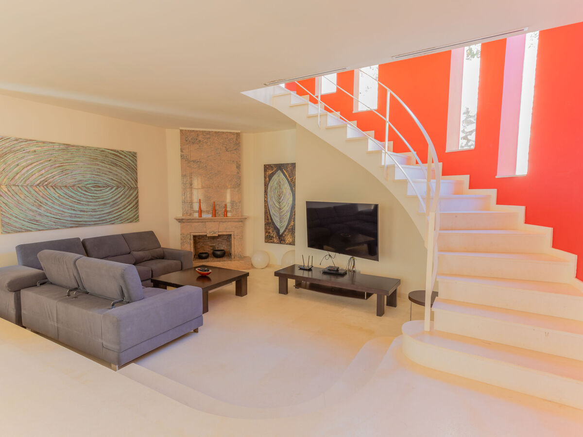 Aménagement confortable et plaisant: grand séjour/salle à manger ouvert avec cheminée (uniquement à titre de décoration), table pour les repas, TV (satellite), Télévision numérique, chaînes de TV internationales et écran plat.