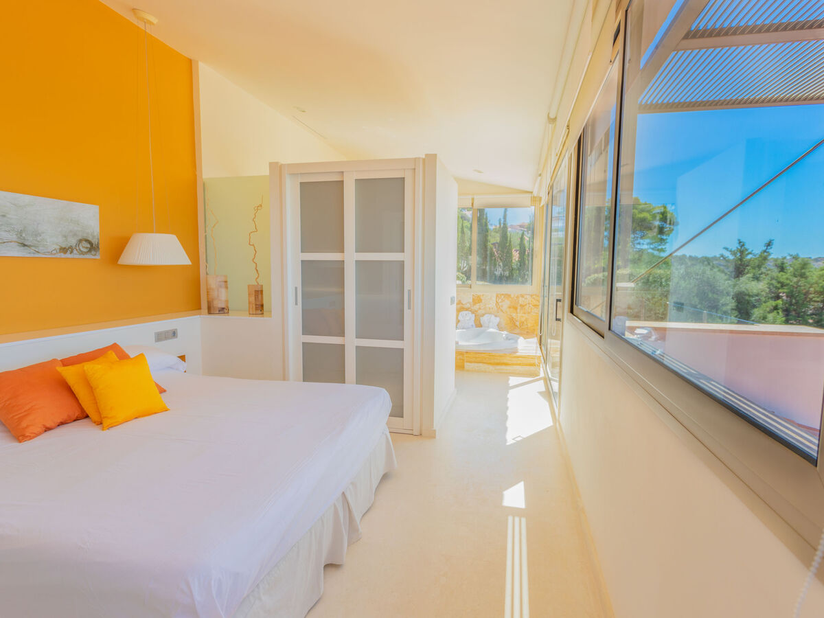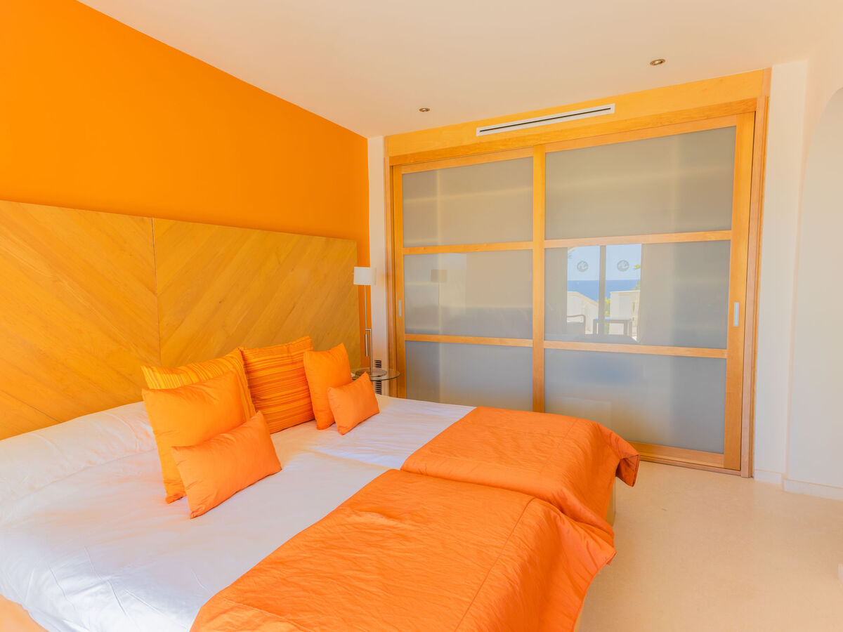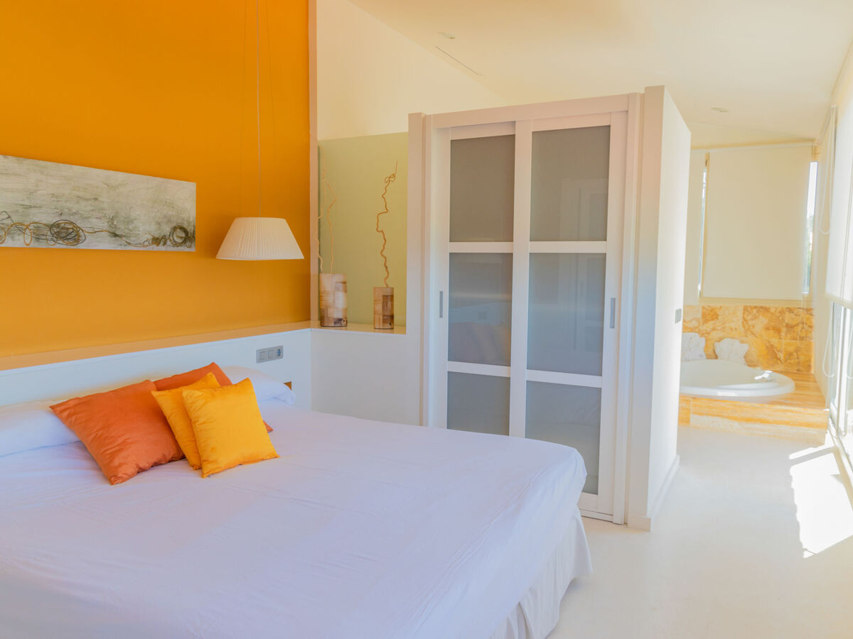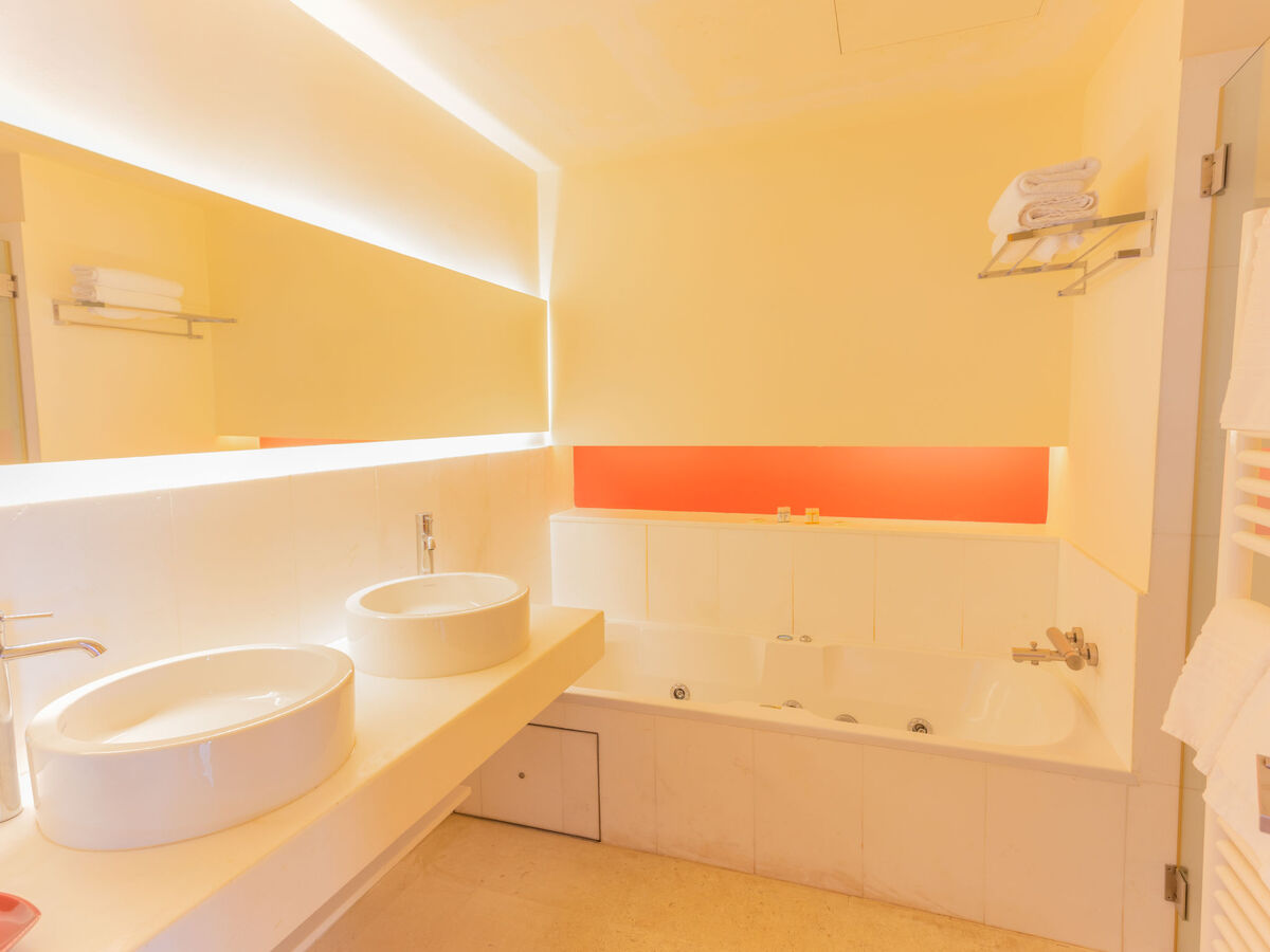 1 grande chambre double avec 1 grand-lit (180 cm, longueur 200 cm), bain/WC, double vasque, bain à remous et air-conditionné.