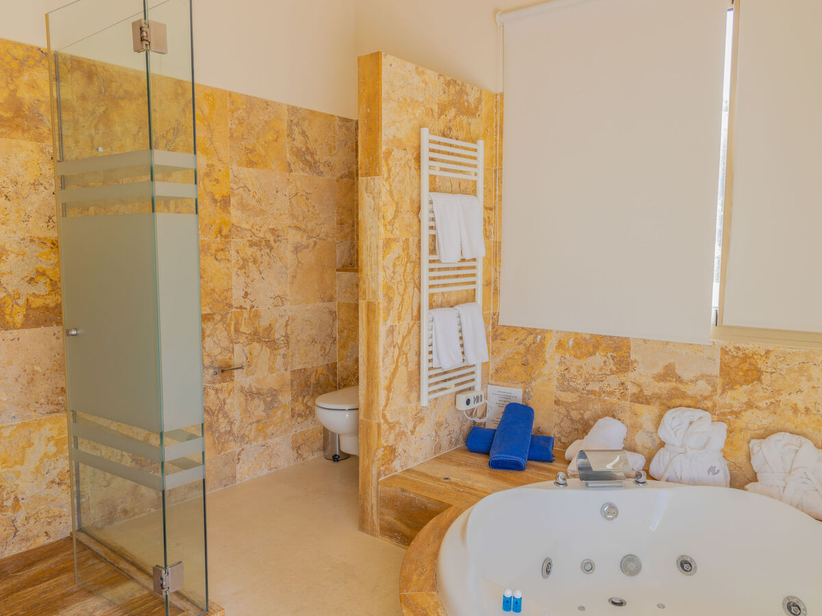 1 grande chambre double avec 1 grand-lit (180 cm, longueur 200 cm), bain/douche/WC, double vasque, bain à remous , TV, chaînes de TV internationales, écran plat et air-conditionné.
