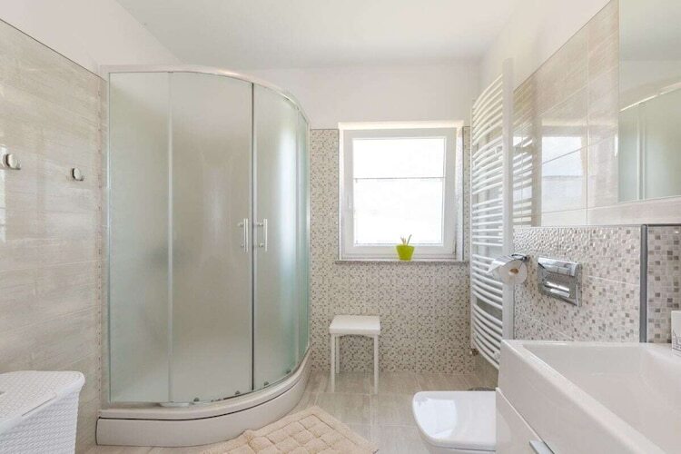 Au premier étage, il y a trois chambres avec des lits doubles et deux salles de bains.