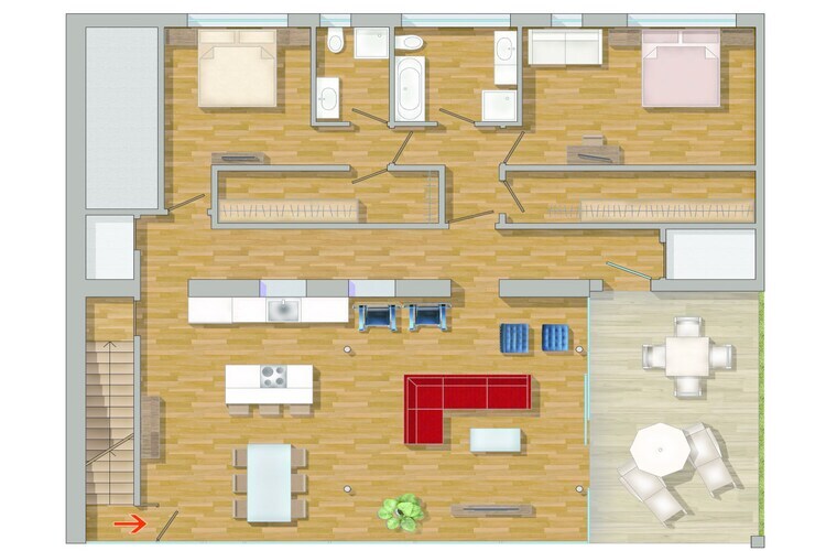 Appartement de vacances exclusif et spacieux avec un mobilier design. Calme mais central, avec accès direct au jardin et espaces de vie entièrement vitrés.