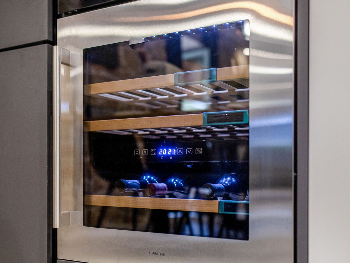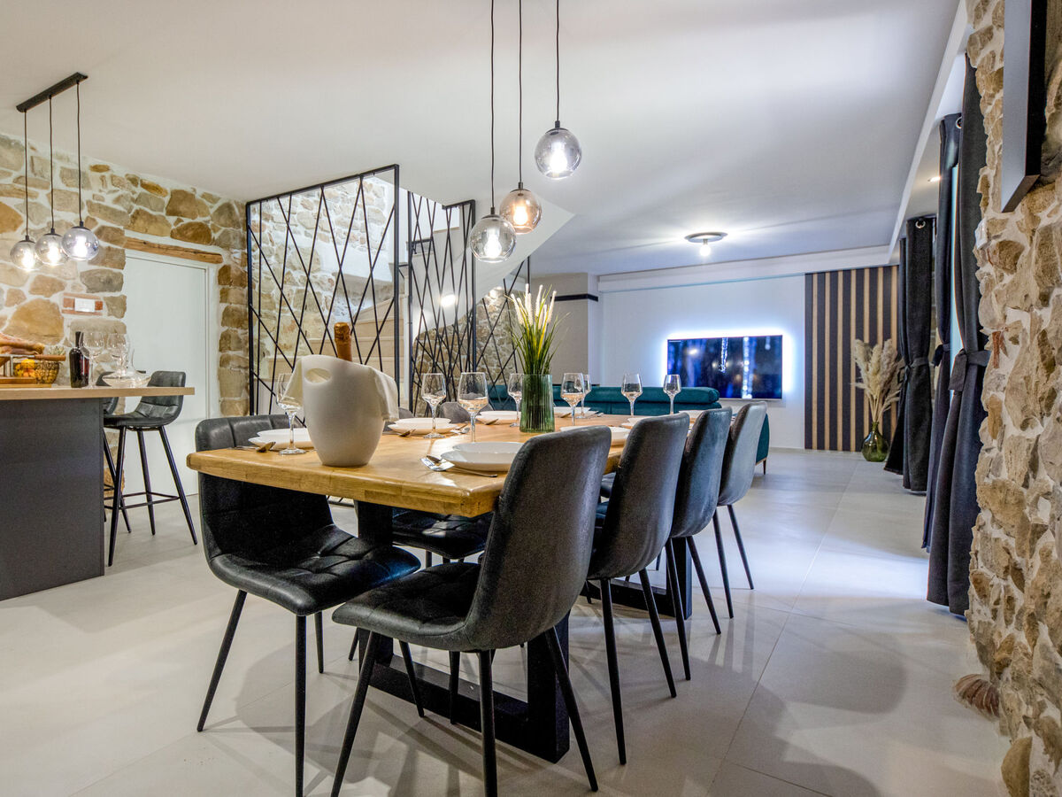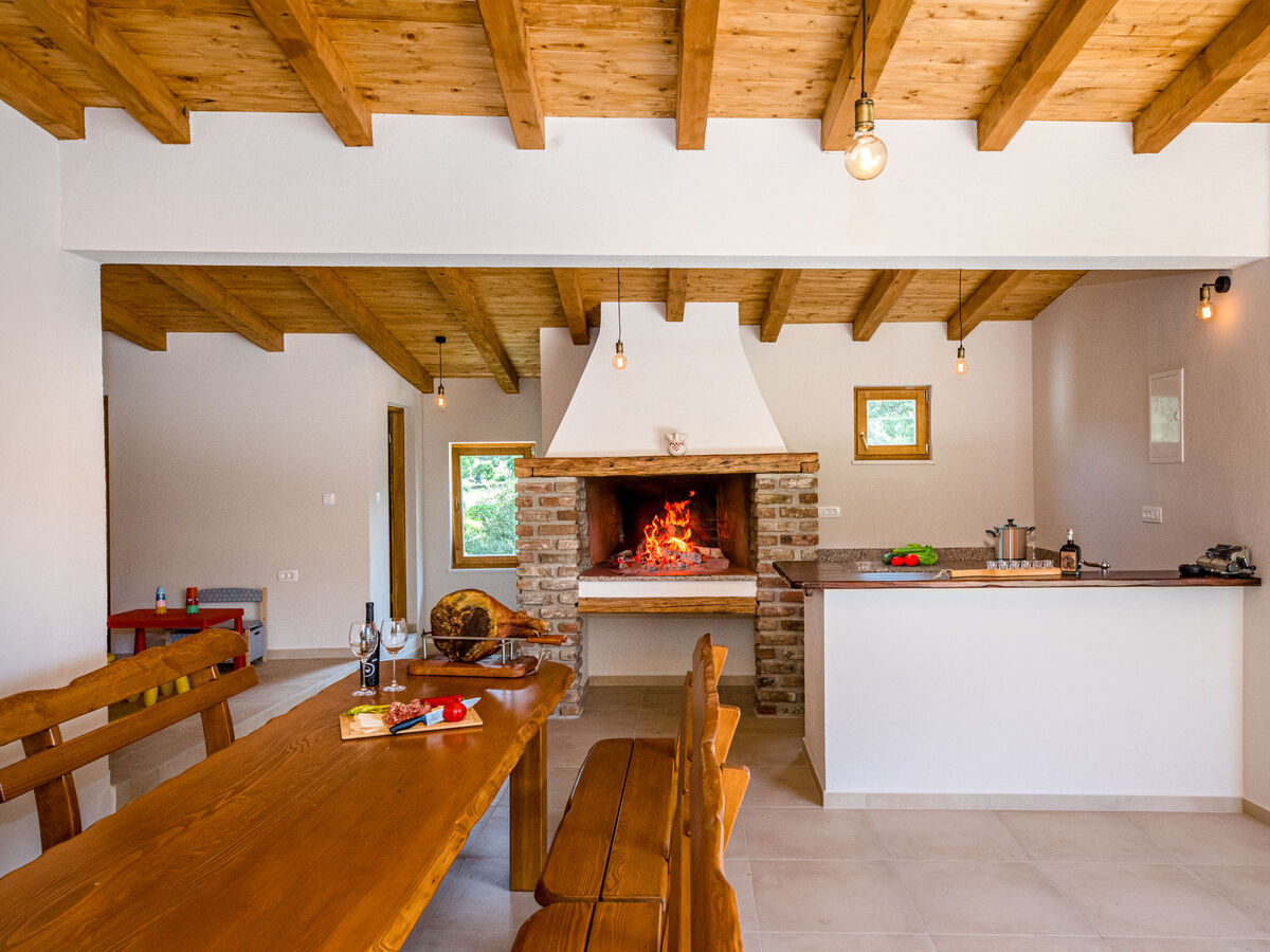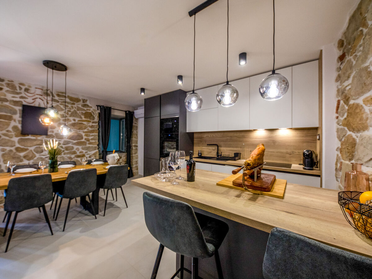 Cuisine ouverte (4 plaques de cuisson, four, lave-vaisselle, micro-ondes, congélateur, gril, cafetière électrique) avec table pour les repas.