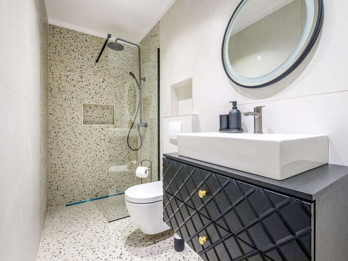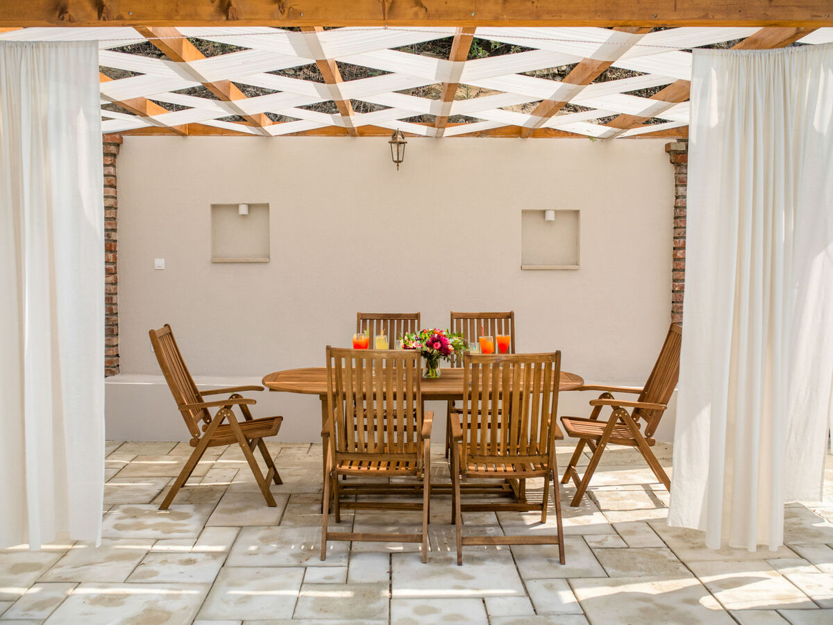 Douche extérieure, terrasse, meubles de jardin, barbecue, espace de jeux pour les enfants.