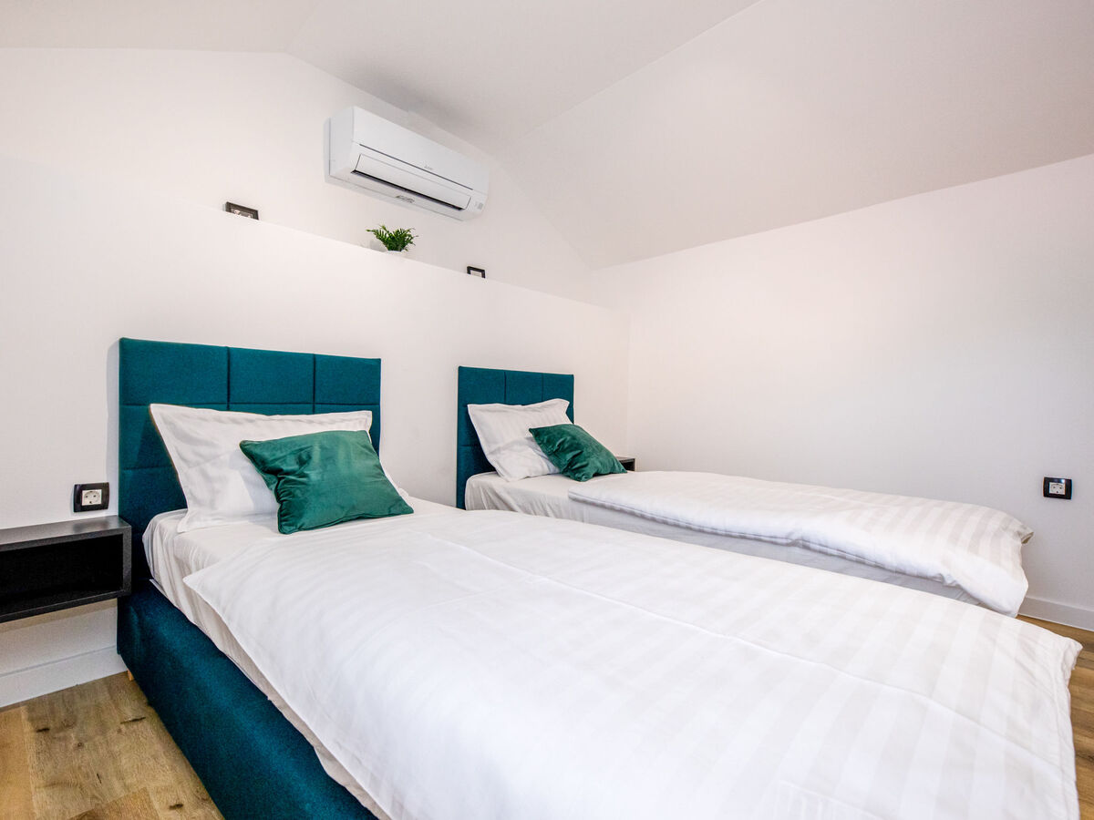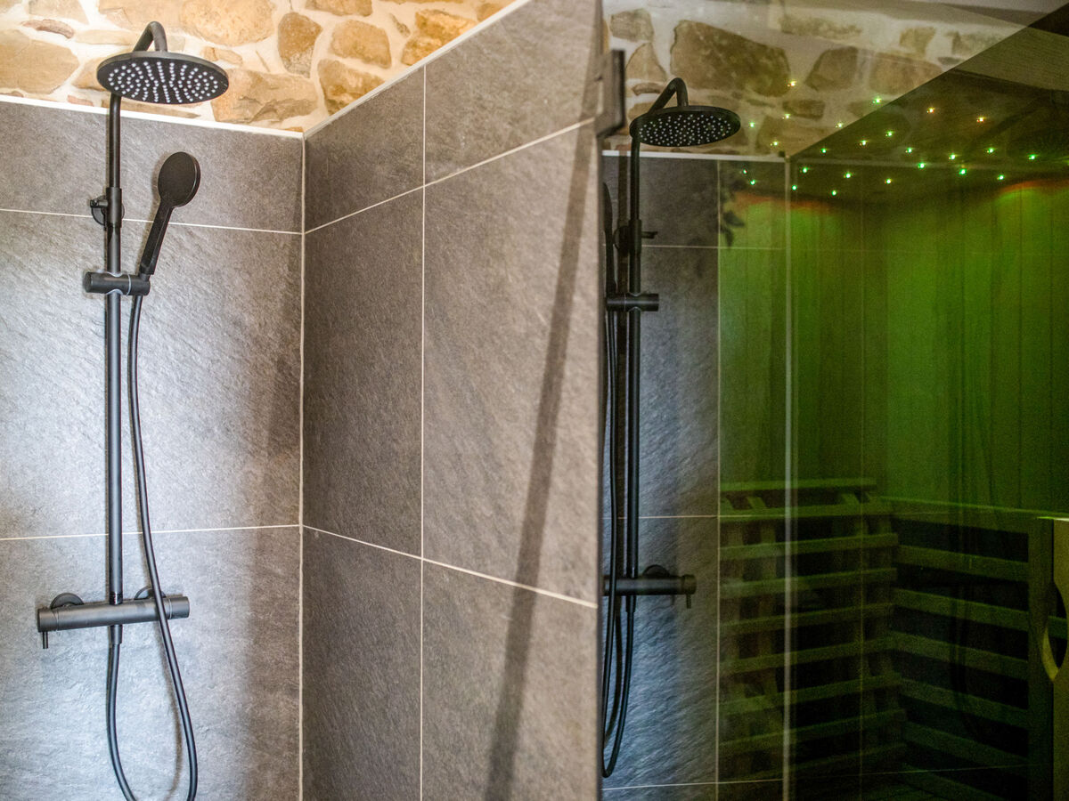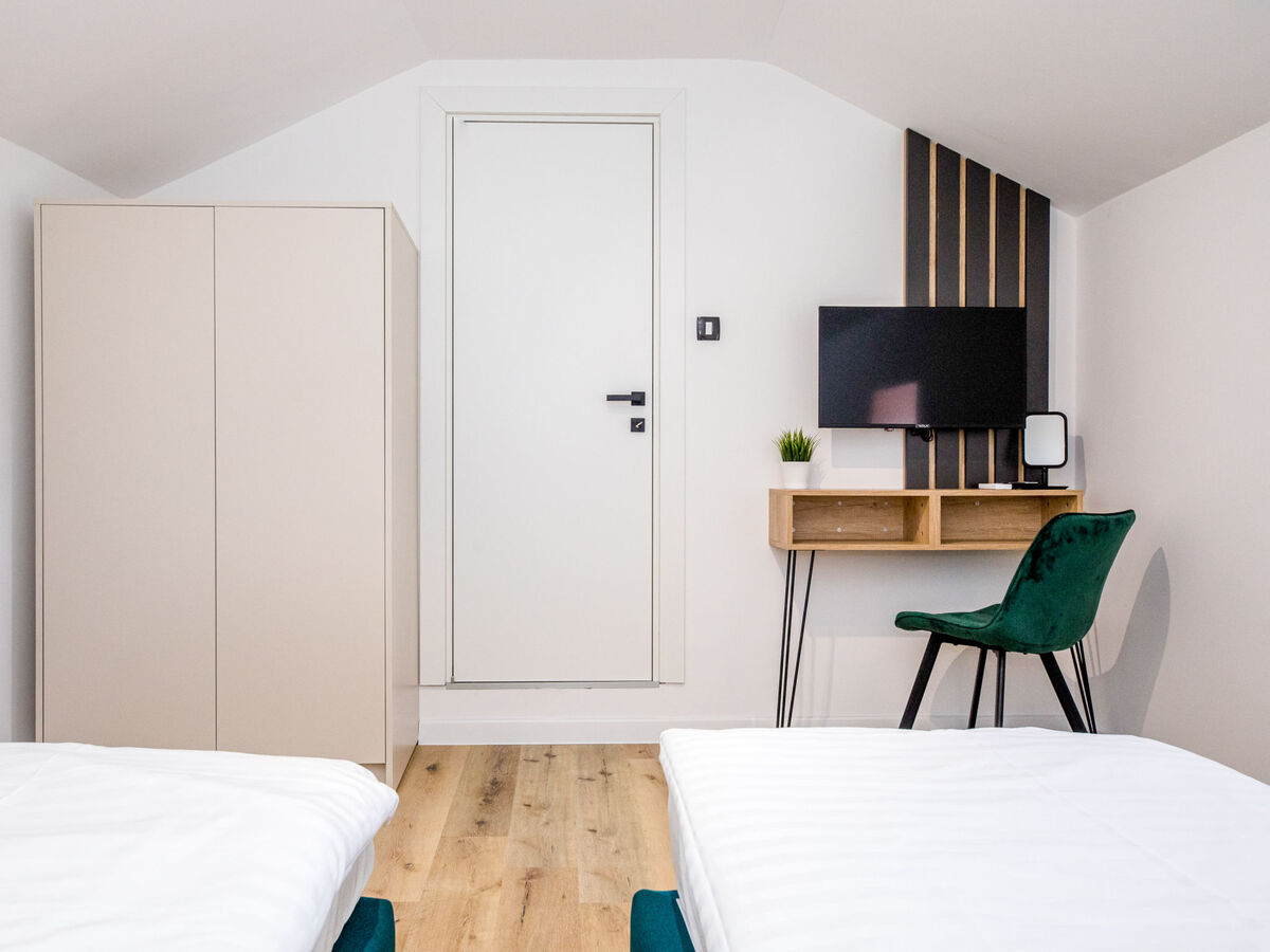 À l'étage inférieur: 2 chambres, chaque chambre avec: 1 grand-lit (160 cm, longueur 200 cm), douche/WC et TV (satellite) (écran plat).