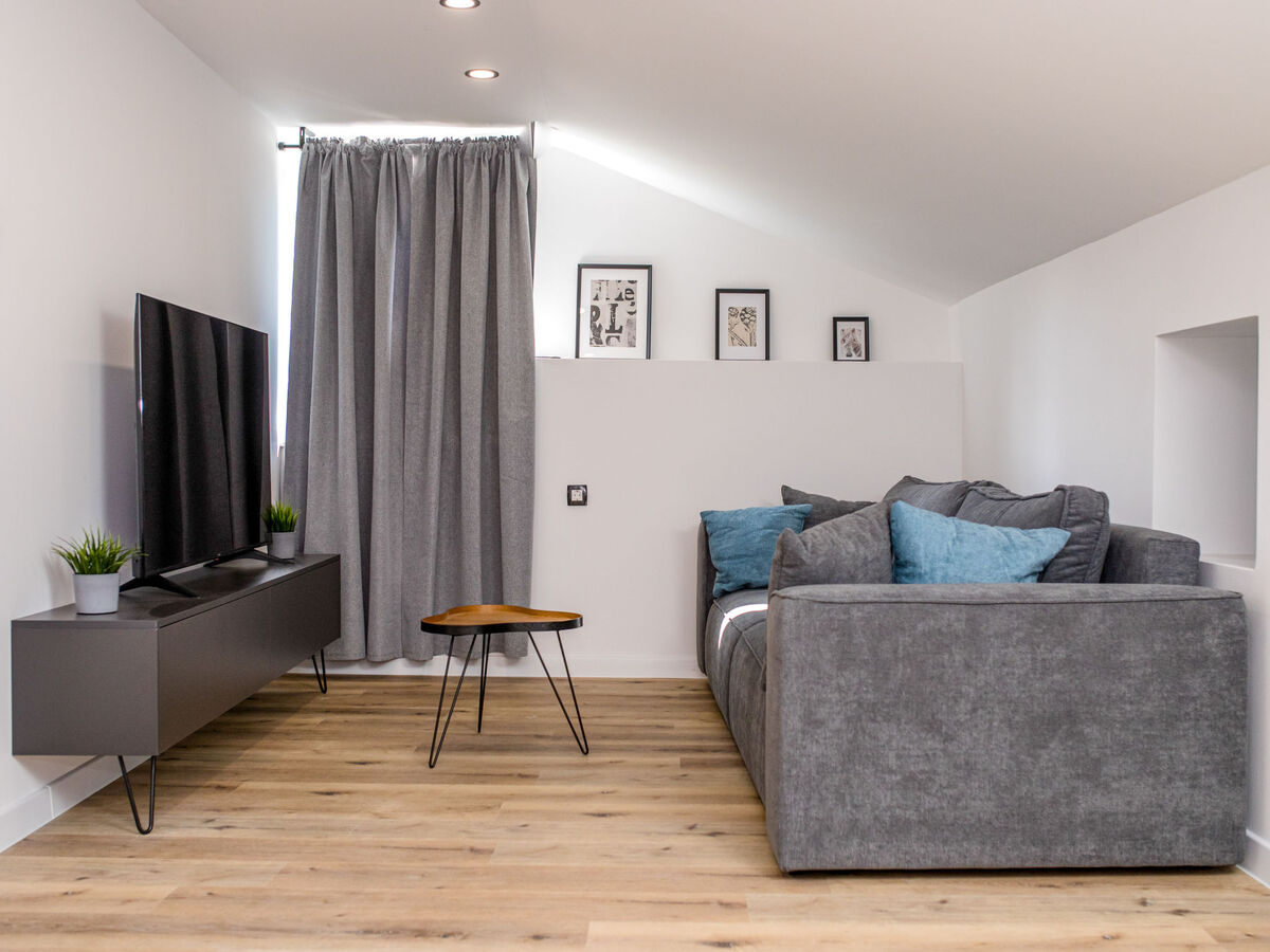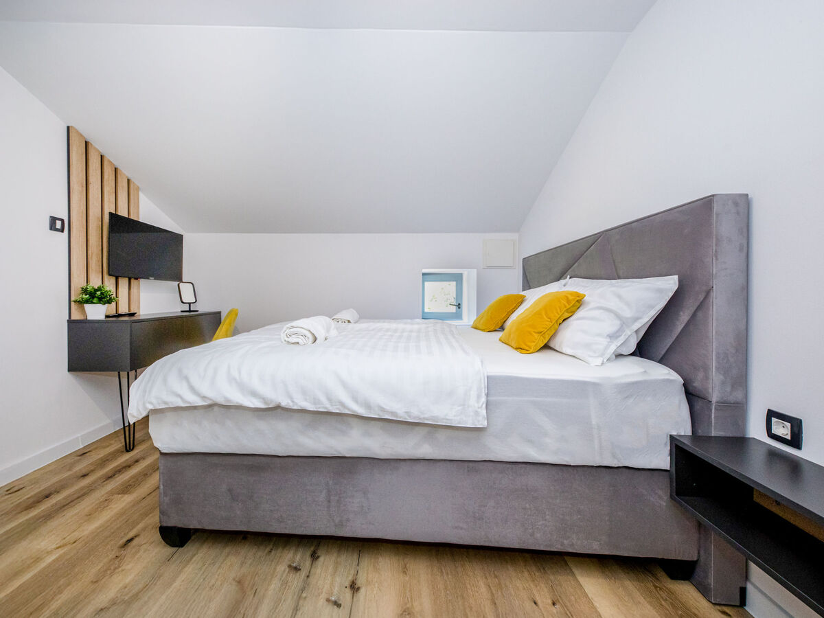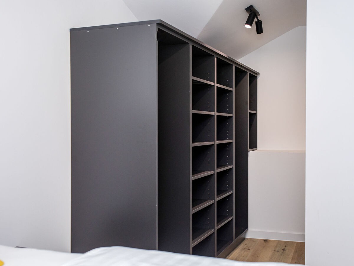À l'étage inférieur: 2 chambres, chaque chambre avec: 1 grand-lit (160 cm, longueur 200 cm), douche/WC et TV (satellite) (écran plat).