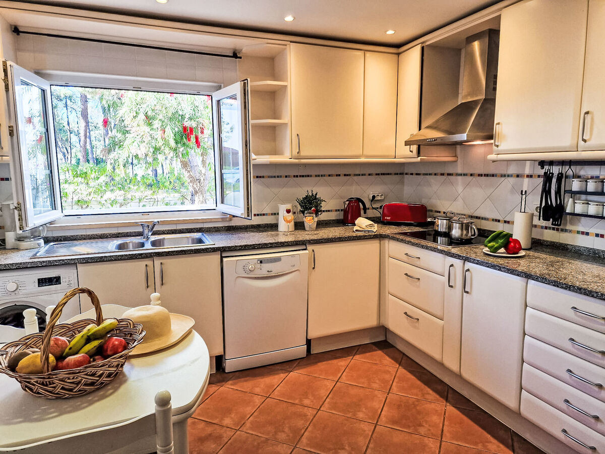 Cuisine (four, lave-vaisselle, 4 plaques vitrocéramiques, grille-pain, bouilloire électrique, micro-ondes, congélateur, cafetière électrique, Capsules pour machine à café (Dolce Gusto not incl)) avec table pour les repas.