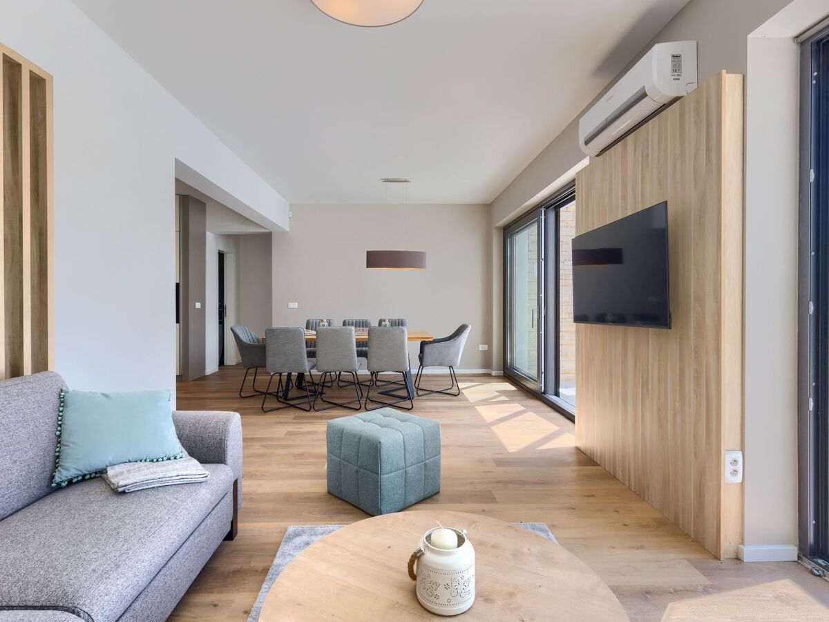 Aménagement moderne et de bon goût: séjour/salle à manger avec 1 divan-lit (140 cm, longueur 200 cm), TV (satellite) et air-conditionné.