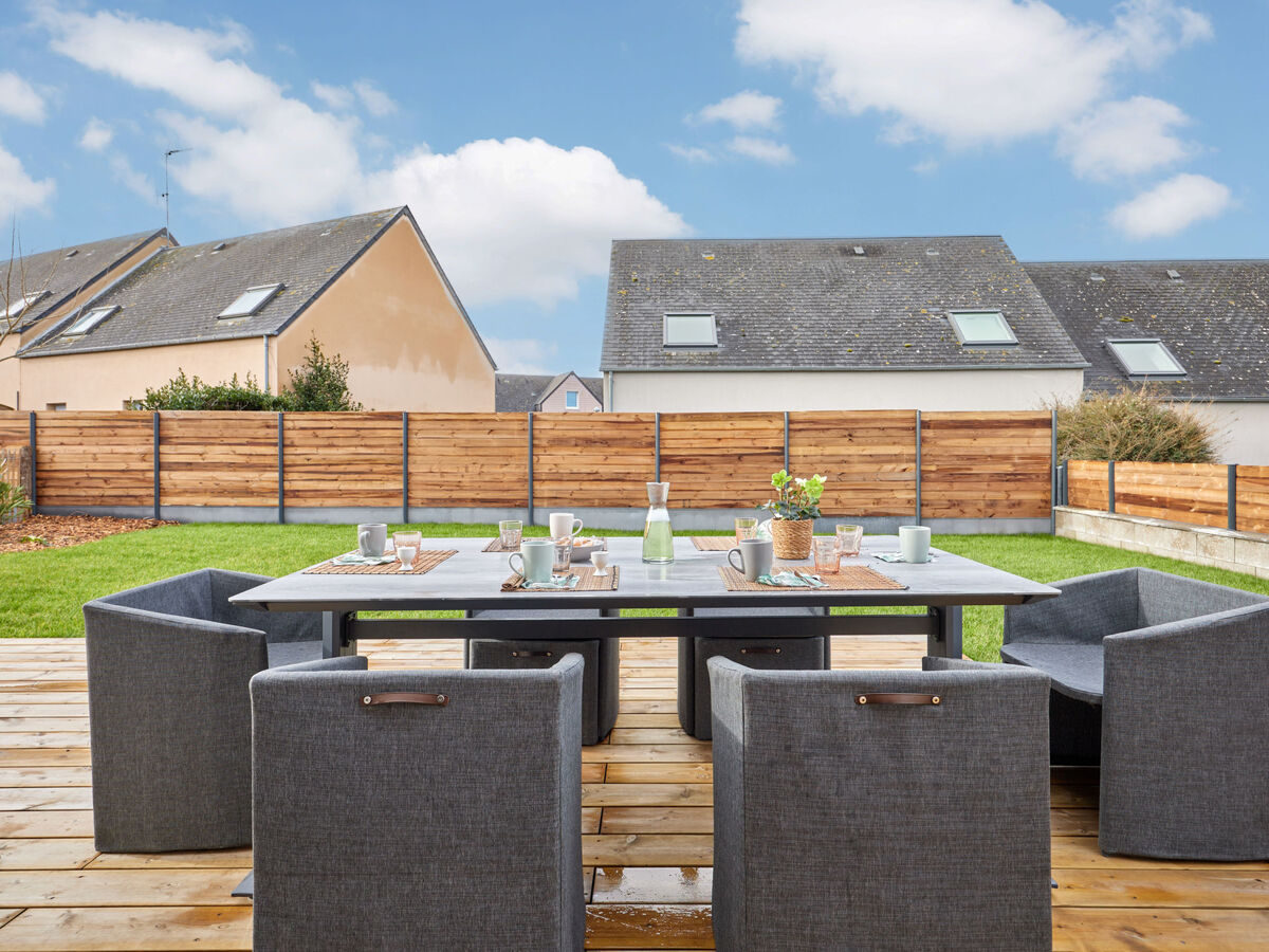 Meubles de terrasse, barbecue, chaises longues.