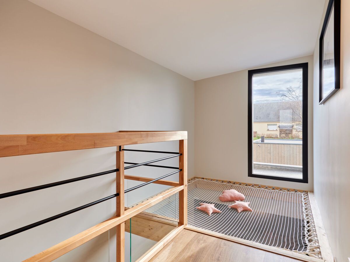 À l'étage supérieur: 1 chambre avec 1 grand-lit (160 cm, longueur 200 cm), TV et écran plat.