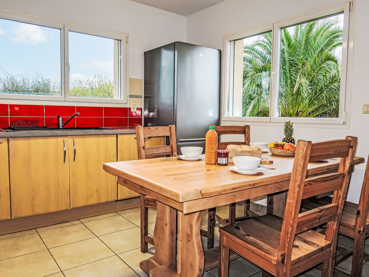 Cuisine ouverte (four, lave-vaisselle, 3 feux, grille-pain, bouilloire électrique, micro-ondes, congélateur, cafetière électrique) avec coin repas.