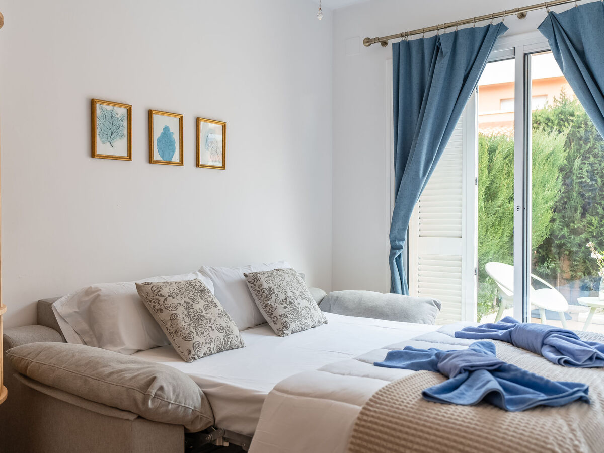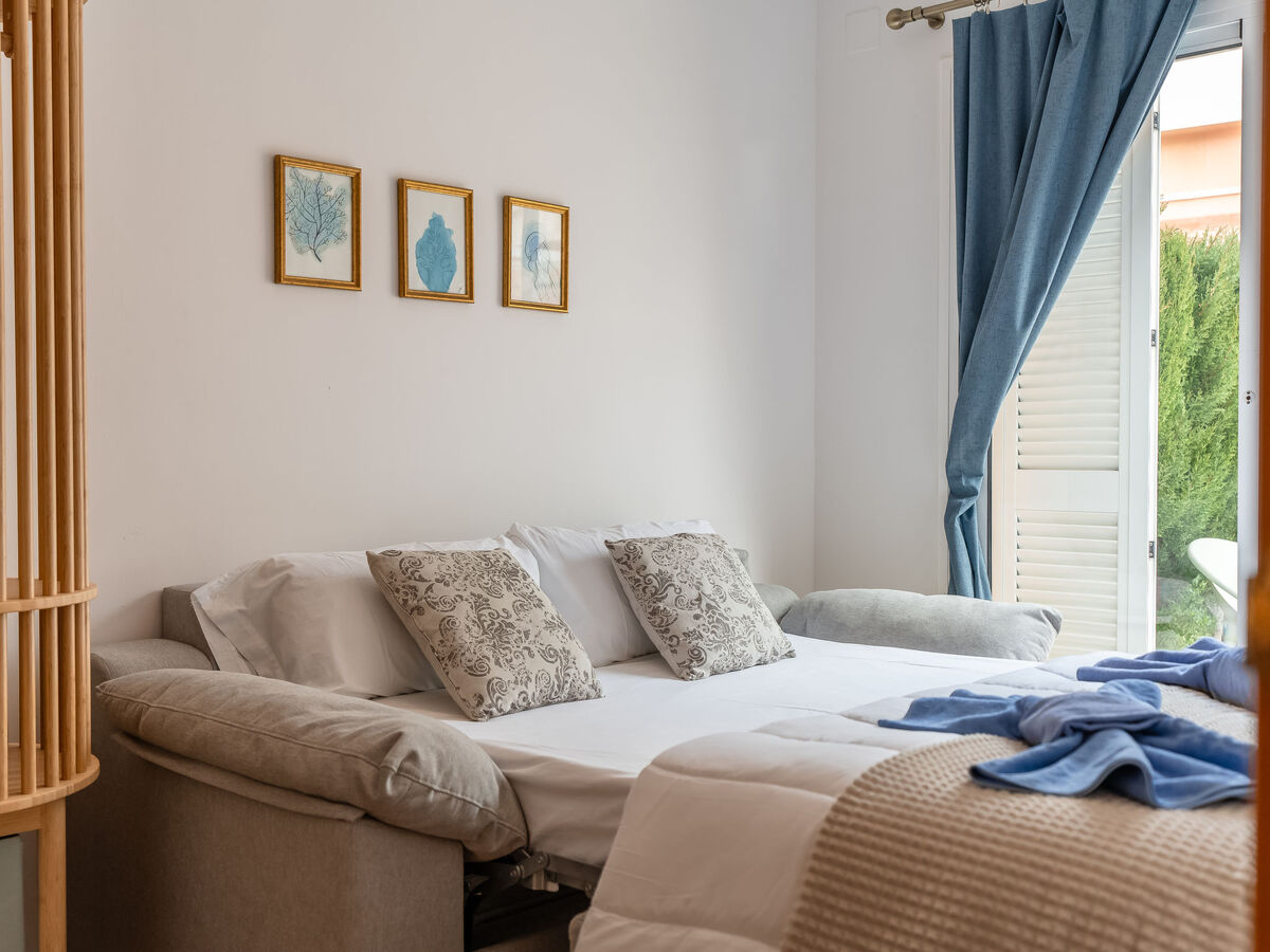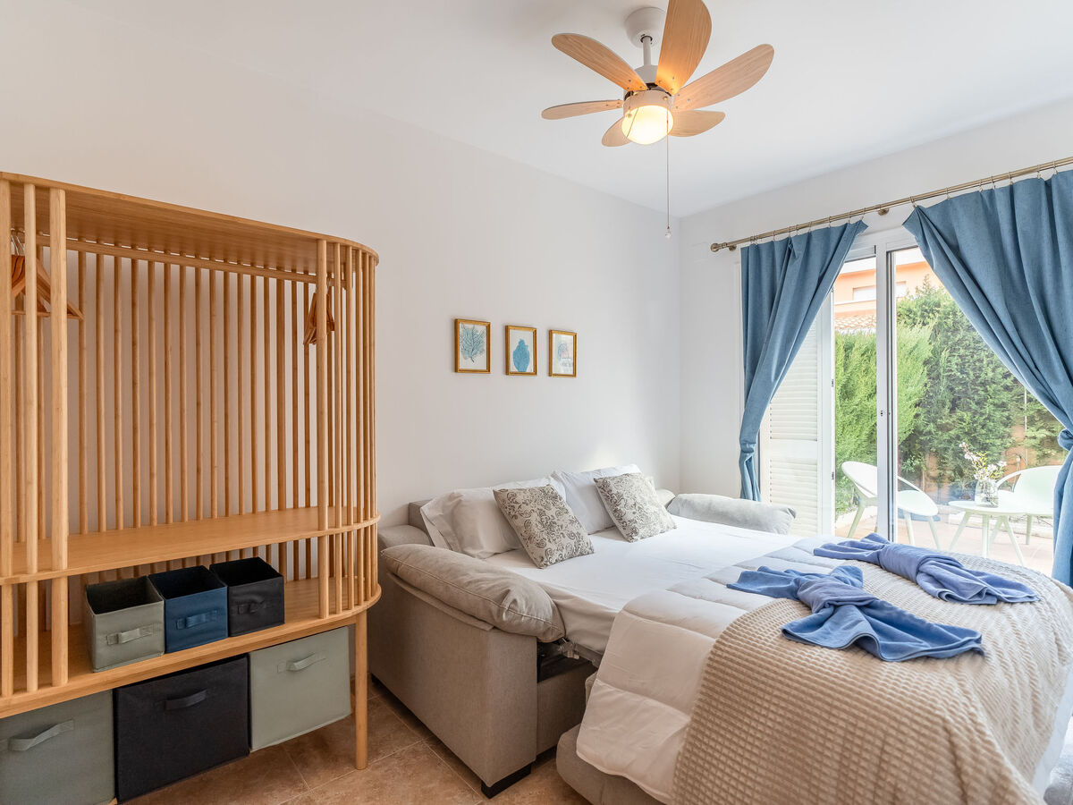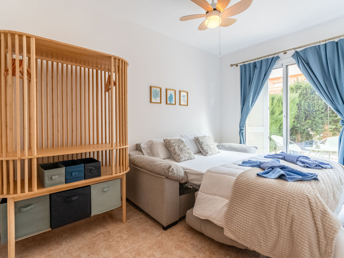 Aménagement fonctionnel: 1 chambre avec 1 divan-lit double (1 x 140 cm, longueur 190 cm), ventilateur.
