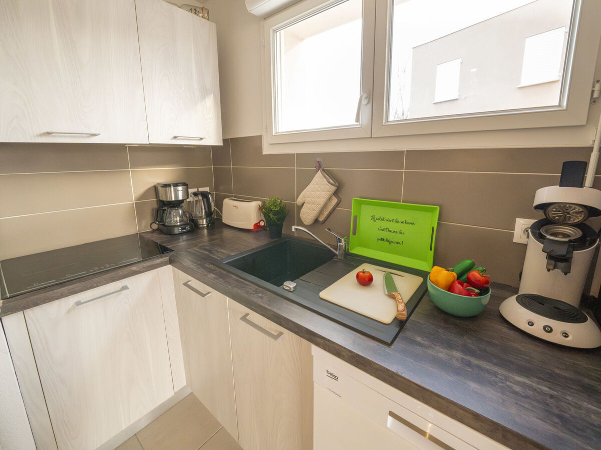 Cuisine ouverte (lave-vaisselle, 3 plaques à induction, grille-pain, bouilloire électrique, micro-ondes, congélateur, cafetière électrique) avec chauffage a gaz.