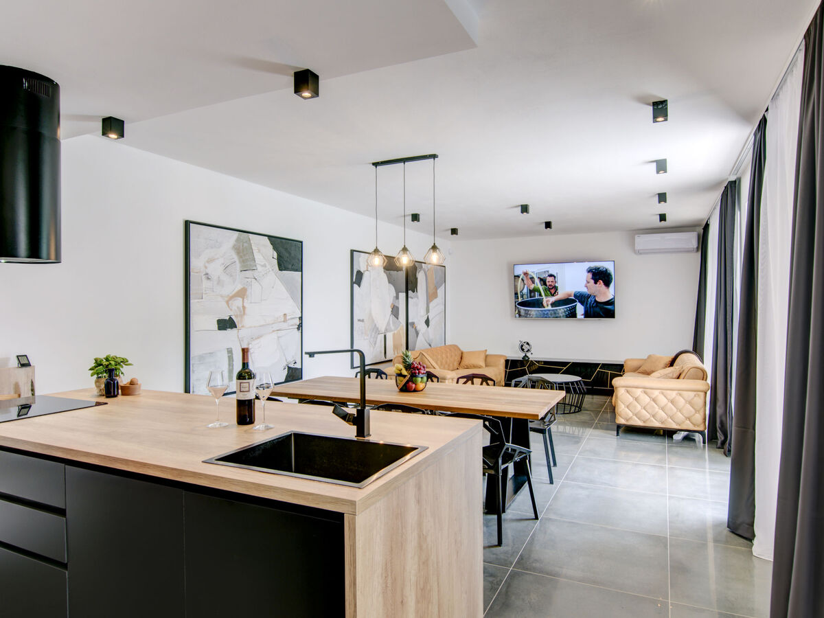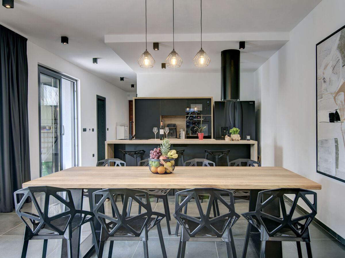 Cuisine ouverte (four, lave-vaisselle, 4 plaques vitrocéramiques, grille-pain, bouilloire électrique, micro-ondes, congélateur, cafetière électrique).