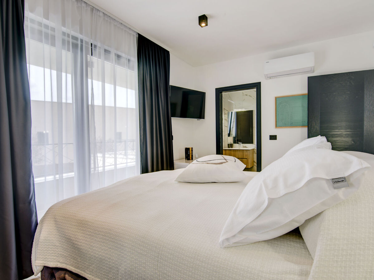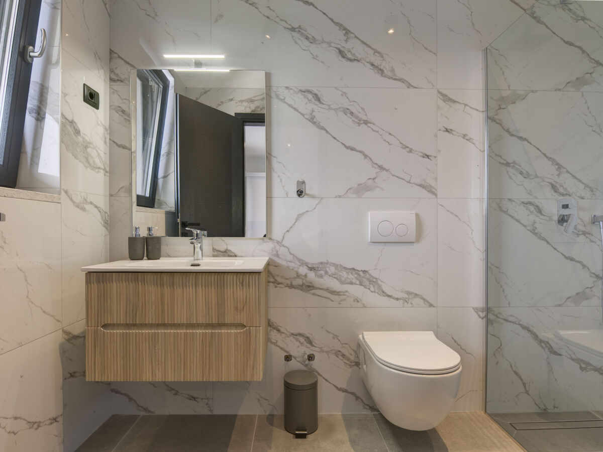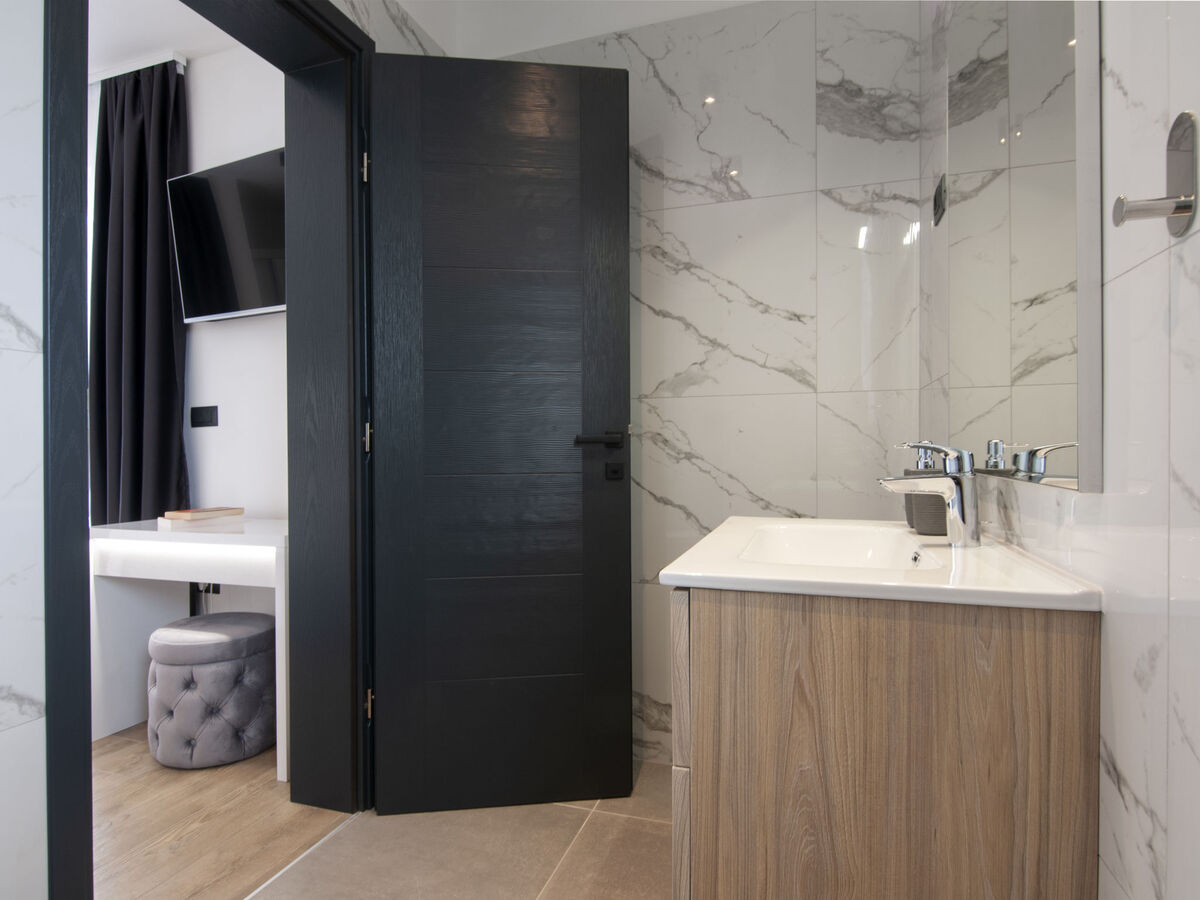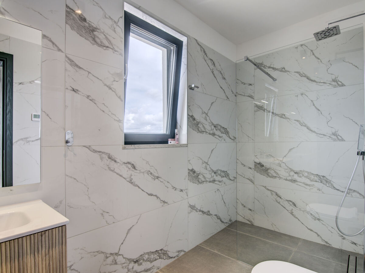 À l'étage supérieur: 3 chambres, chaque chambre avec: 1 grand-lit (160 cm, longueur 200 cm), douche/WC et TV (satellite) (écran plat).