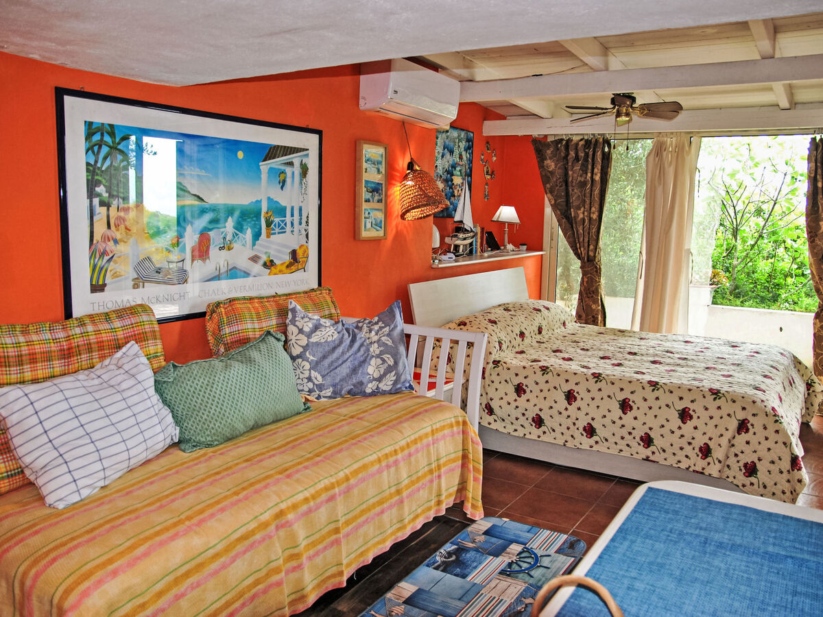 1 chambre avec 1 lit, 1 lit double, douche/bidet/WC, air-conditionné et ventilateur.