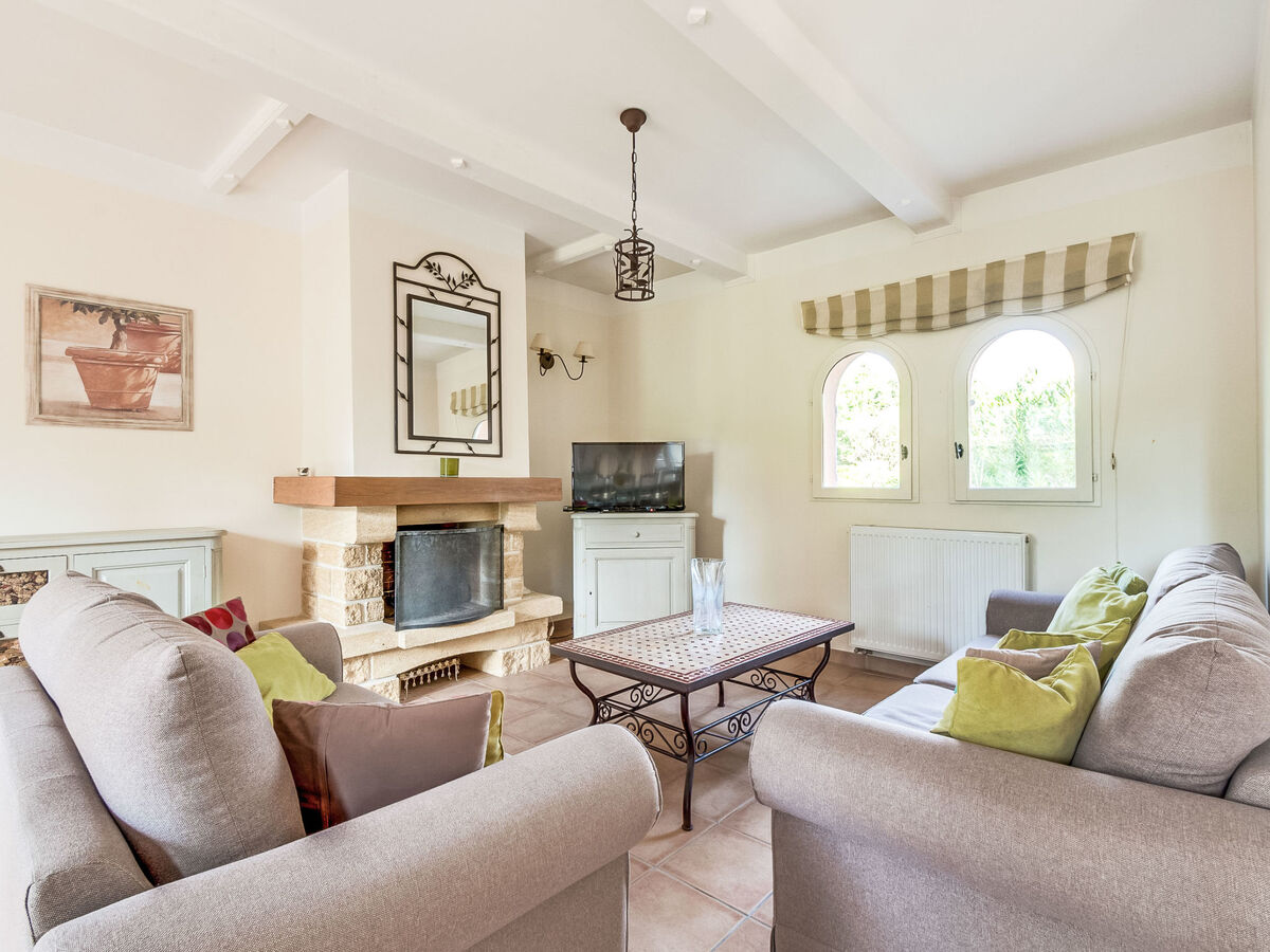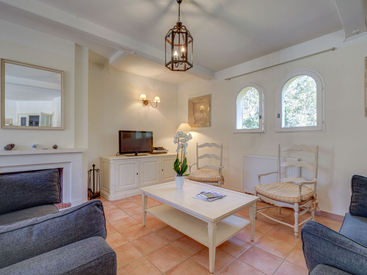 Aménagement de bon goût: séjour/salle à manger avec cheminée, table pour les repas et TV (satellite).