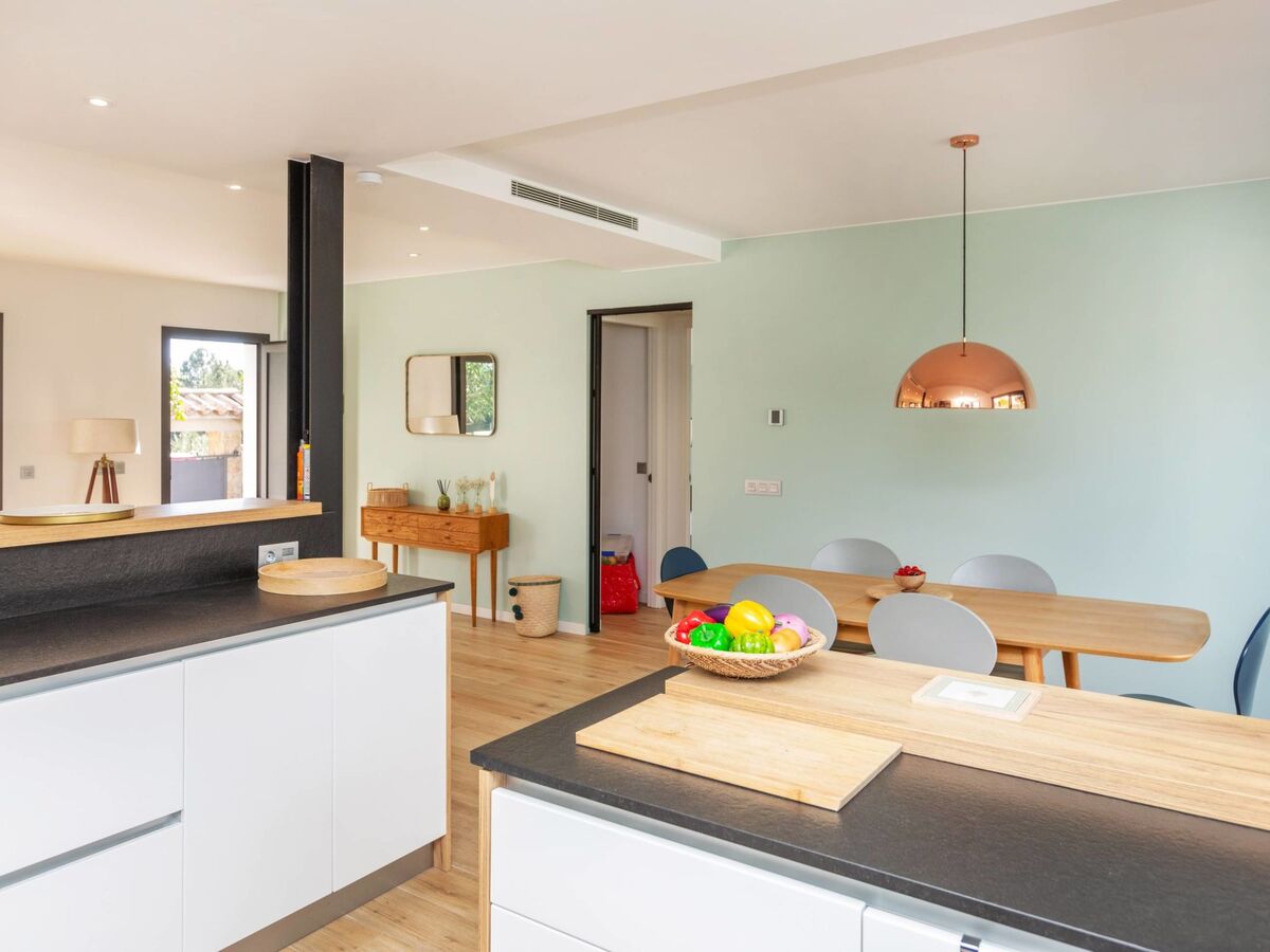 Cuisine ouverte (four, lave-vaisselle, 4 plaques vitrocéramiques, grille-pain, bouilloire électrique, micro-ondes, congélateur, cafetière électrique).