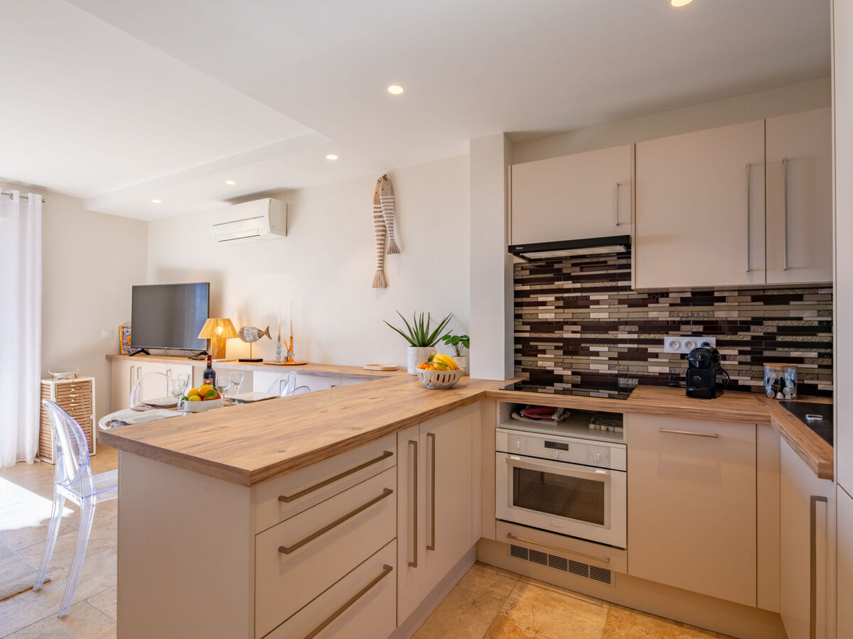 Cuisine ouverte (four, lave-vaisselle, 4 plaques vitrocéramiques, grille-pain, bouilloire électrique, micro-ondes, congélateur, cafetière électrique).