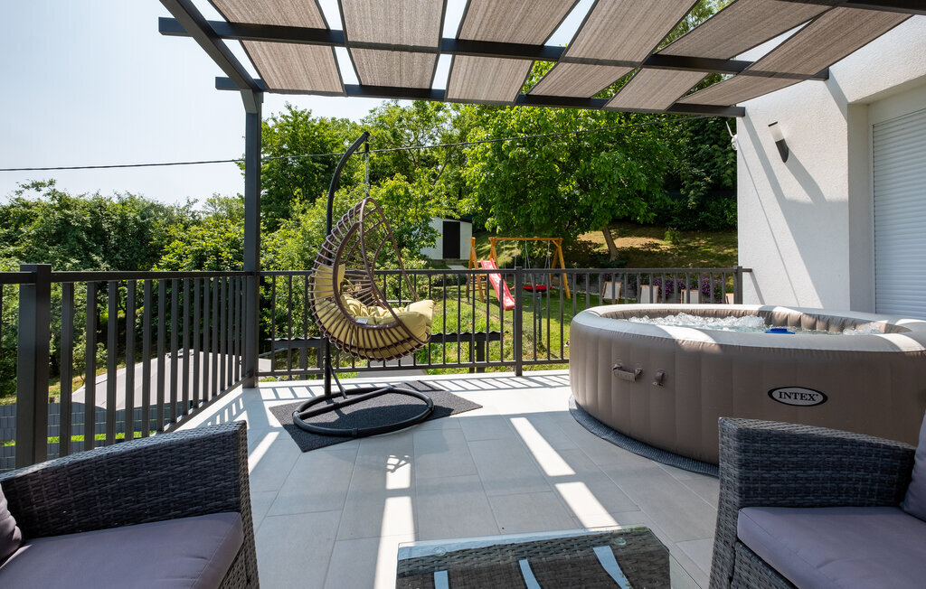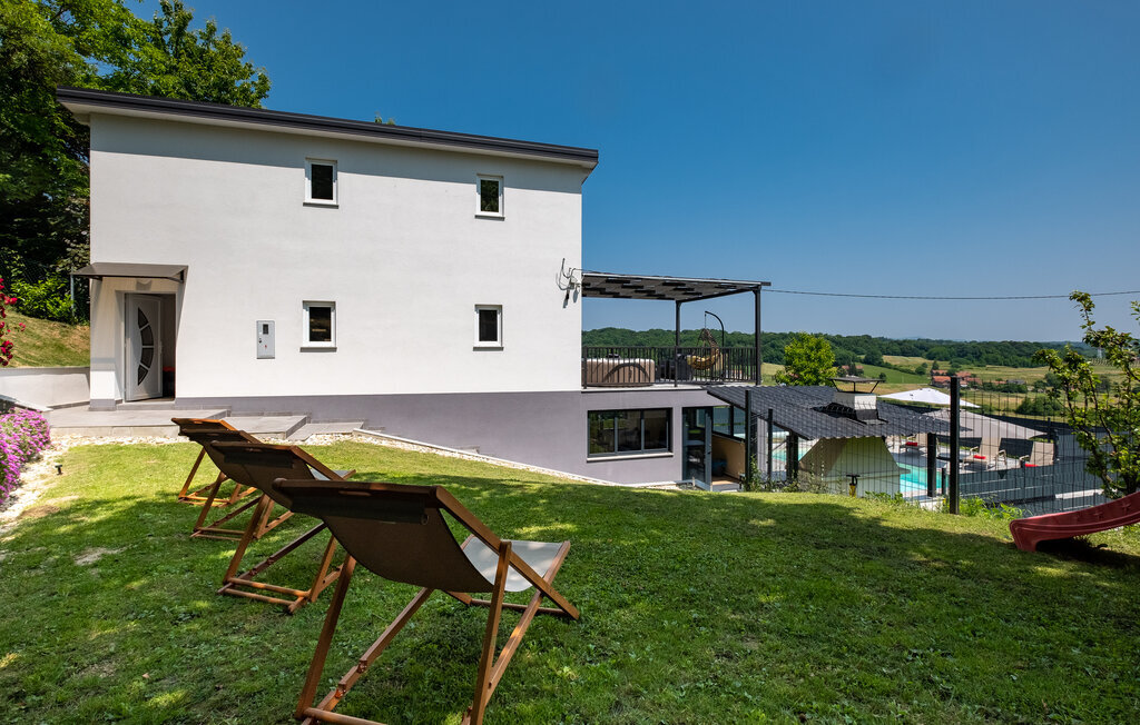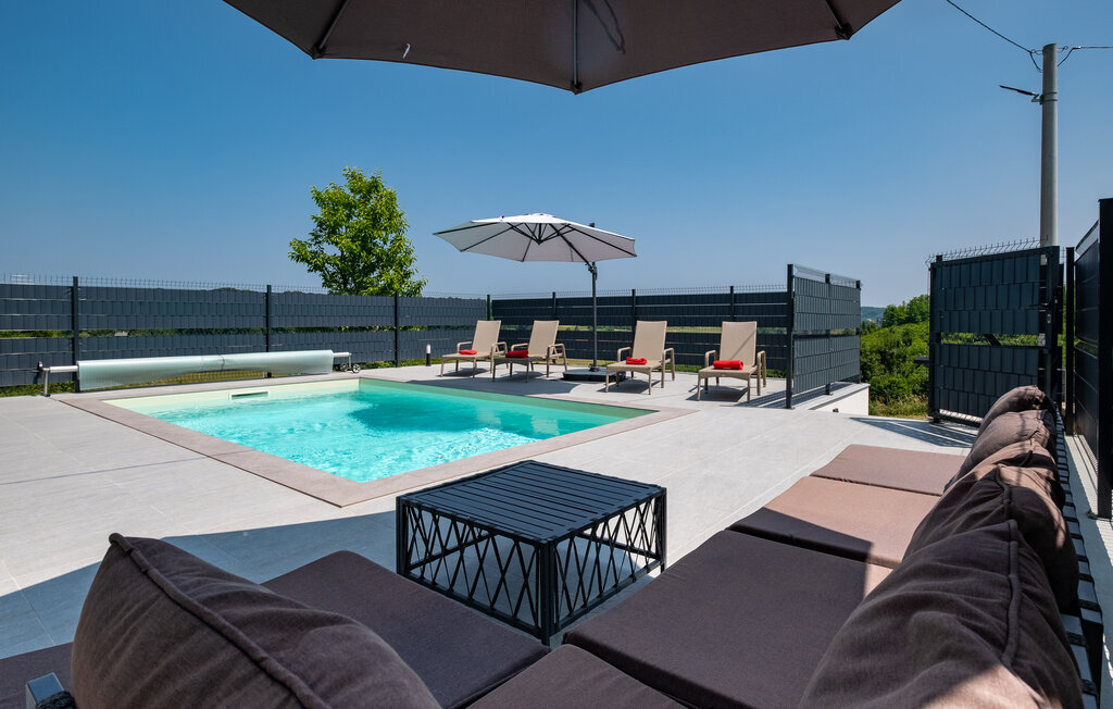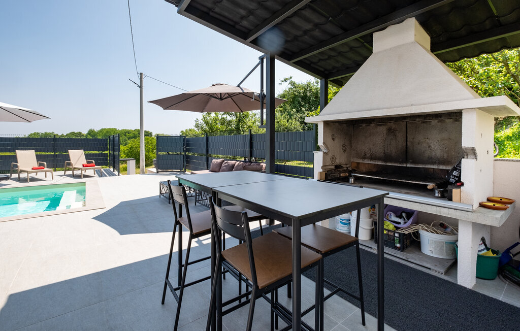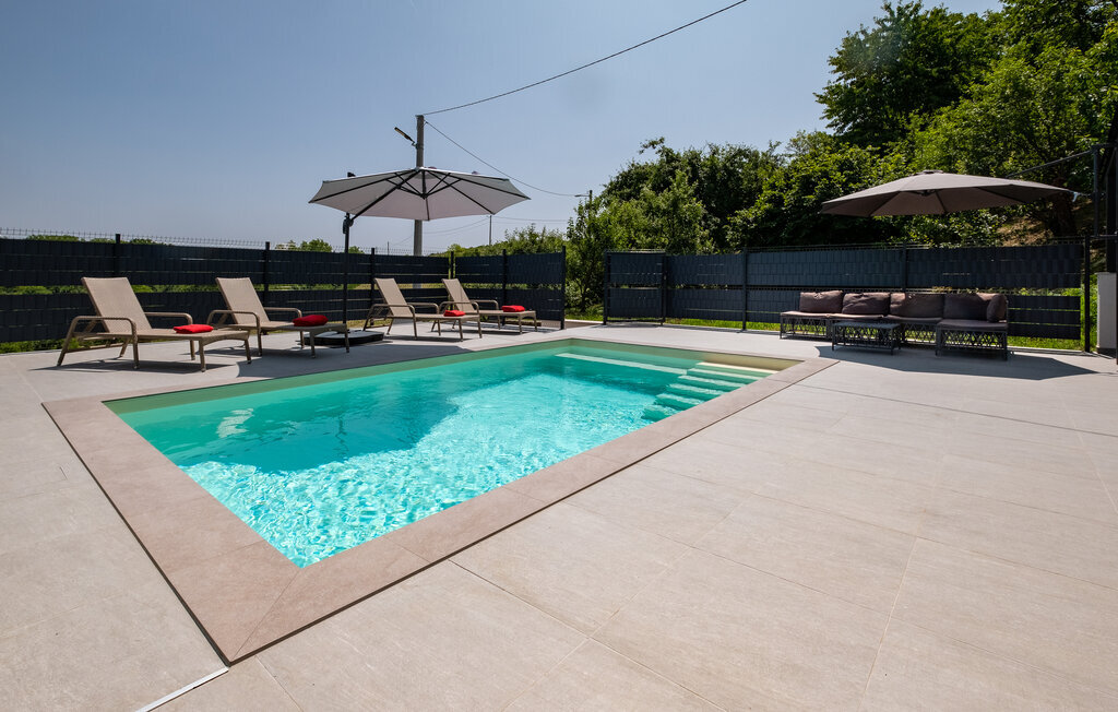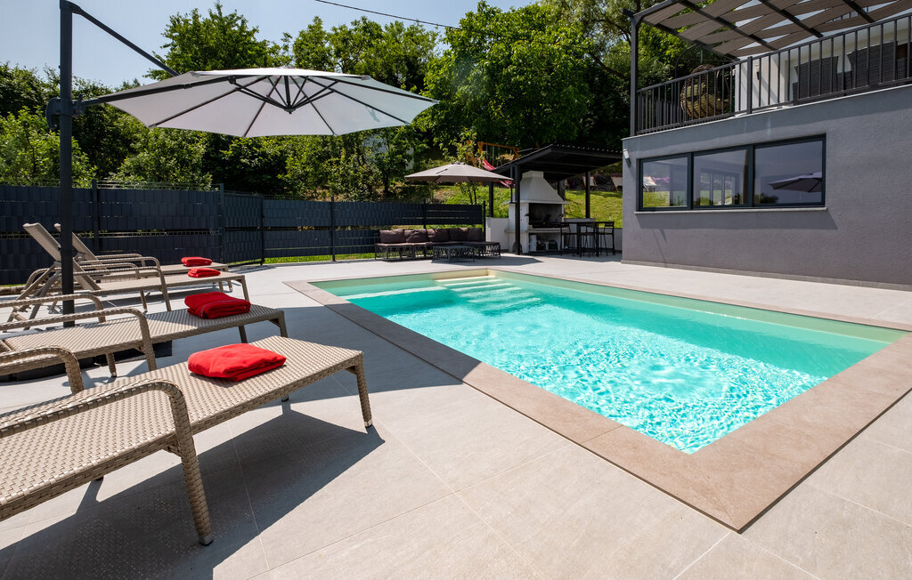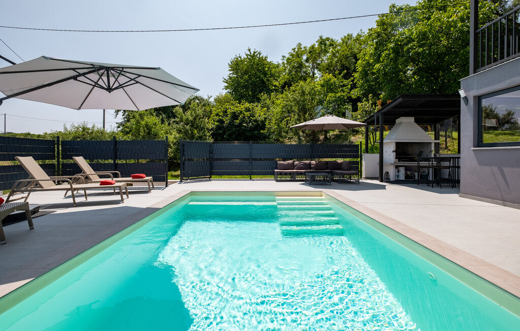 Le vaste espace extérieur vous promet de longues heures sous le soleil croate. Commencez la journée par un petit-déjeuner sur la terrasse, rafraîchissez-vous dans la piscine ou détendez-vous sur les chaises longues dans le jardin bien entretenu. Offrez-vous un apéritif sur l'accueillant salon du balcon, laissez votre regard se perdre sur les environs idylliques et organisez des soirées barbecue pleines d'ambiance.