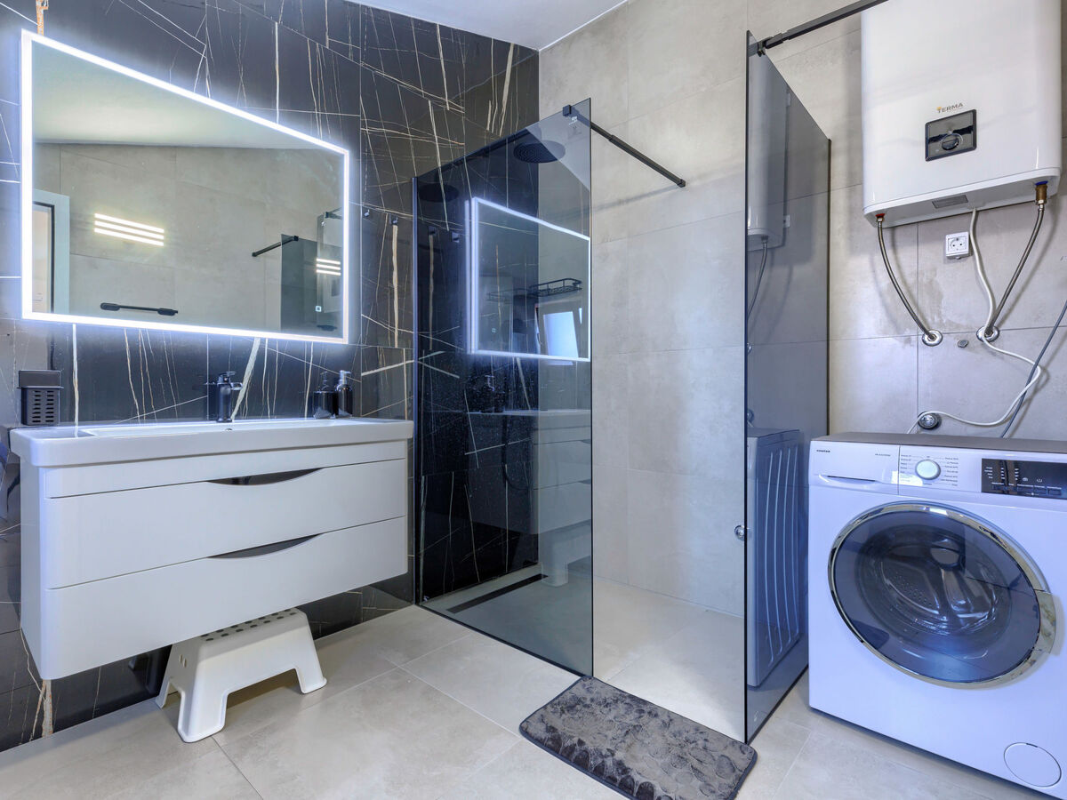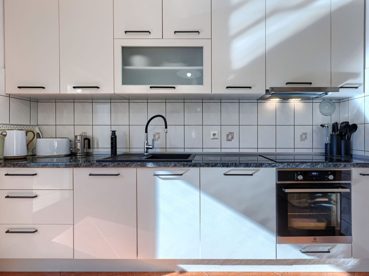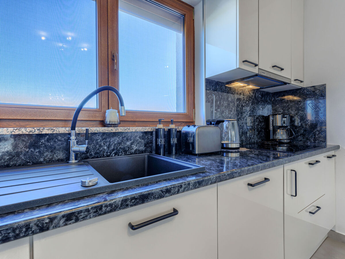 Cuisine ouverte (four, lave-vaisselle, 4 plaques à induction, grille-pain, bouilloire électrique, micro-ondes, congélateur, cafetière électrique).