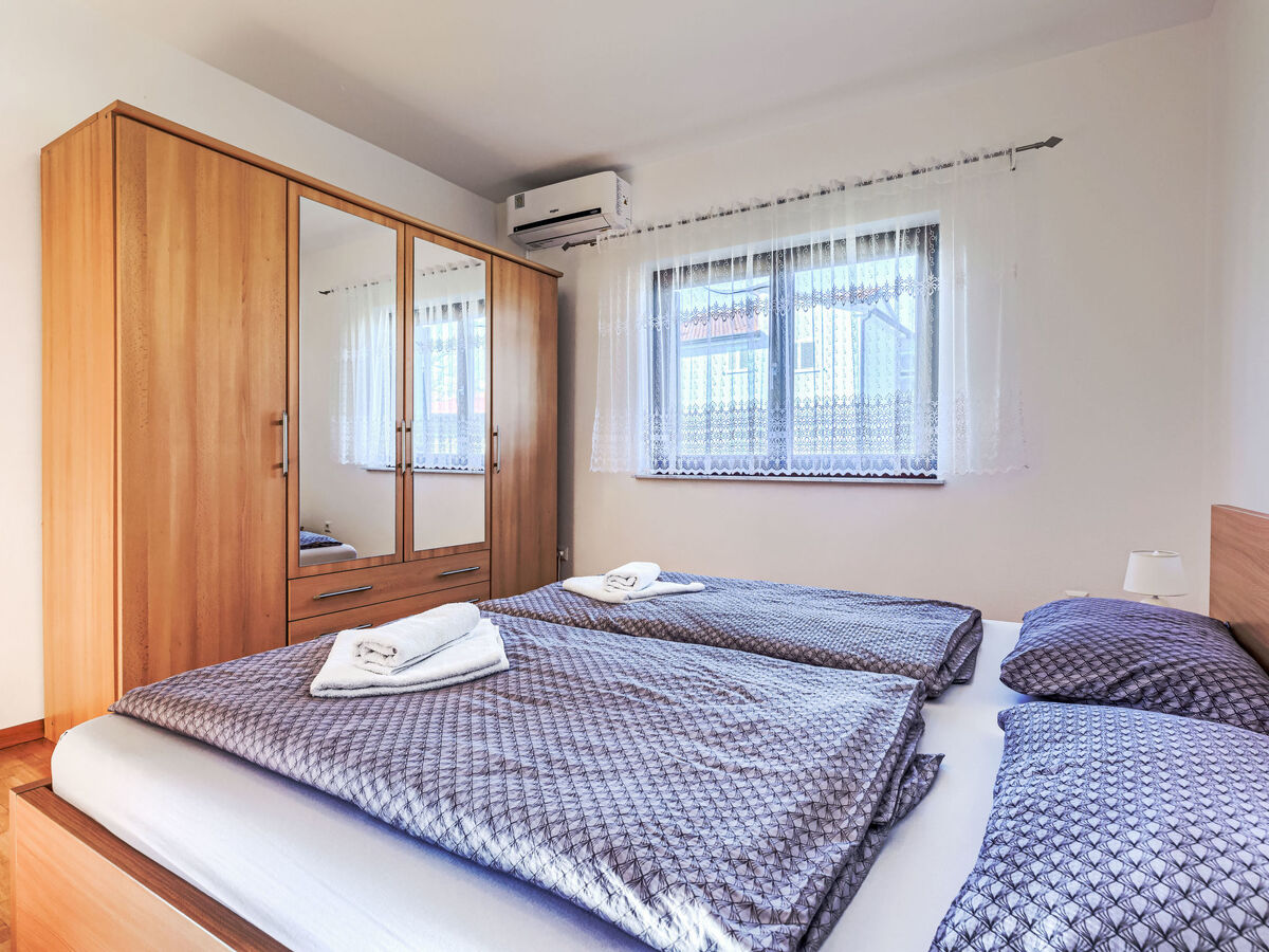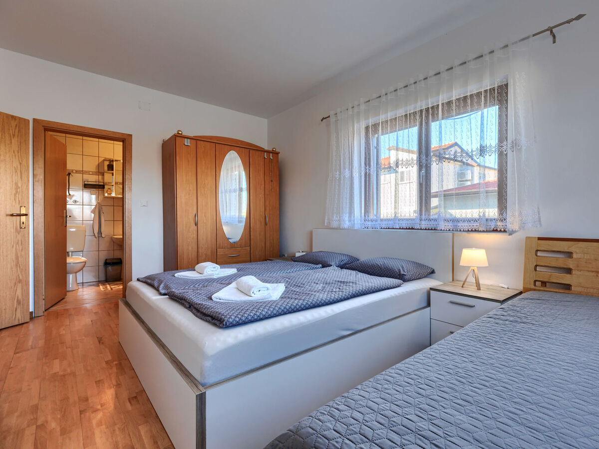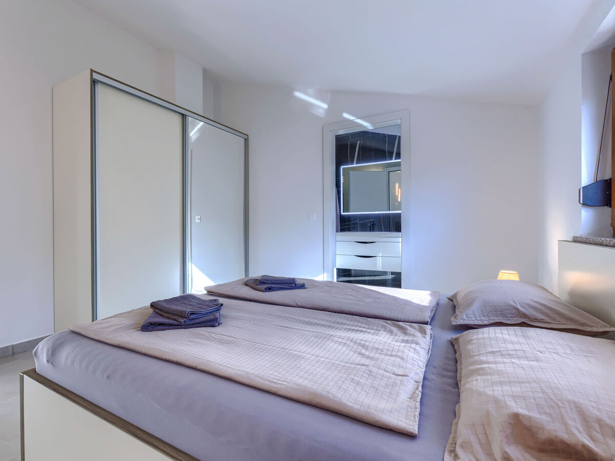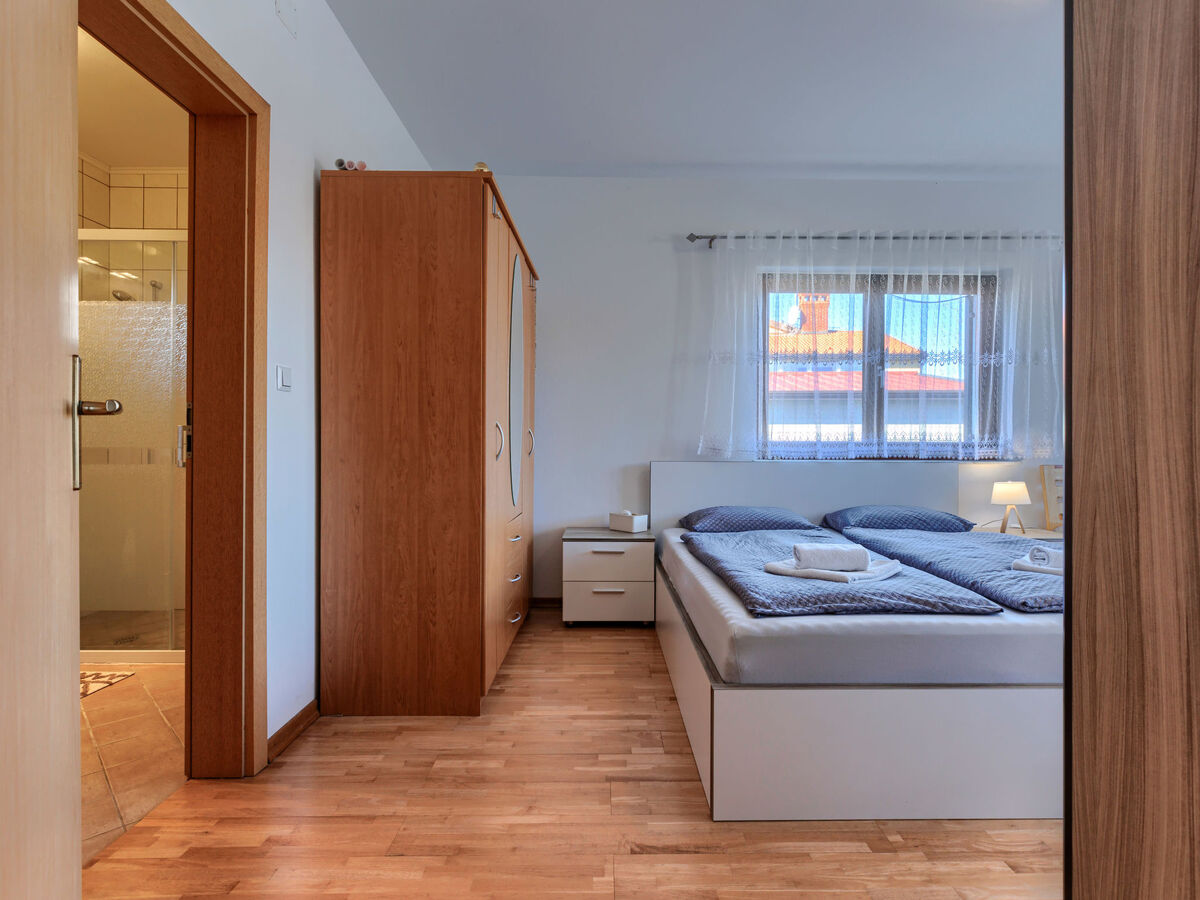 1 chambre avec 1 grand-lit (180 cm, longueur 200 cm), douche/WC.