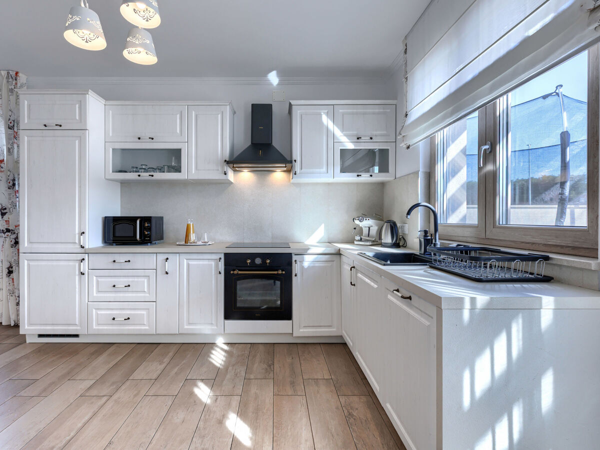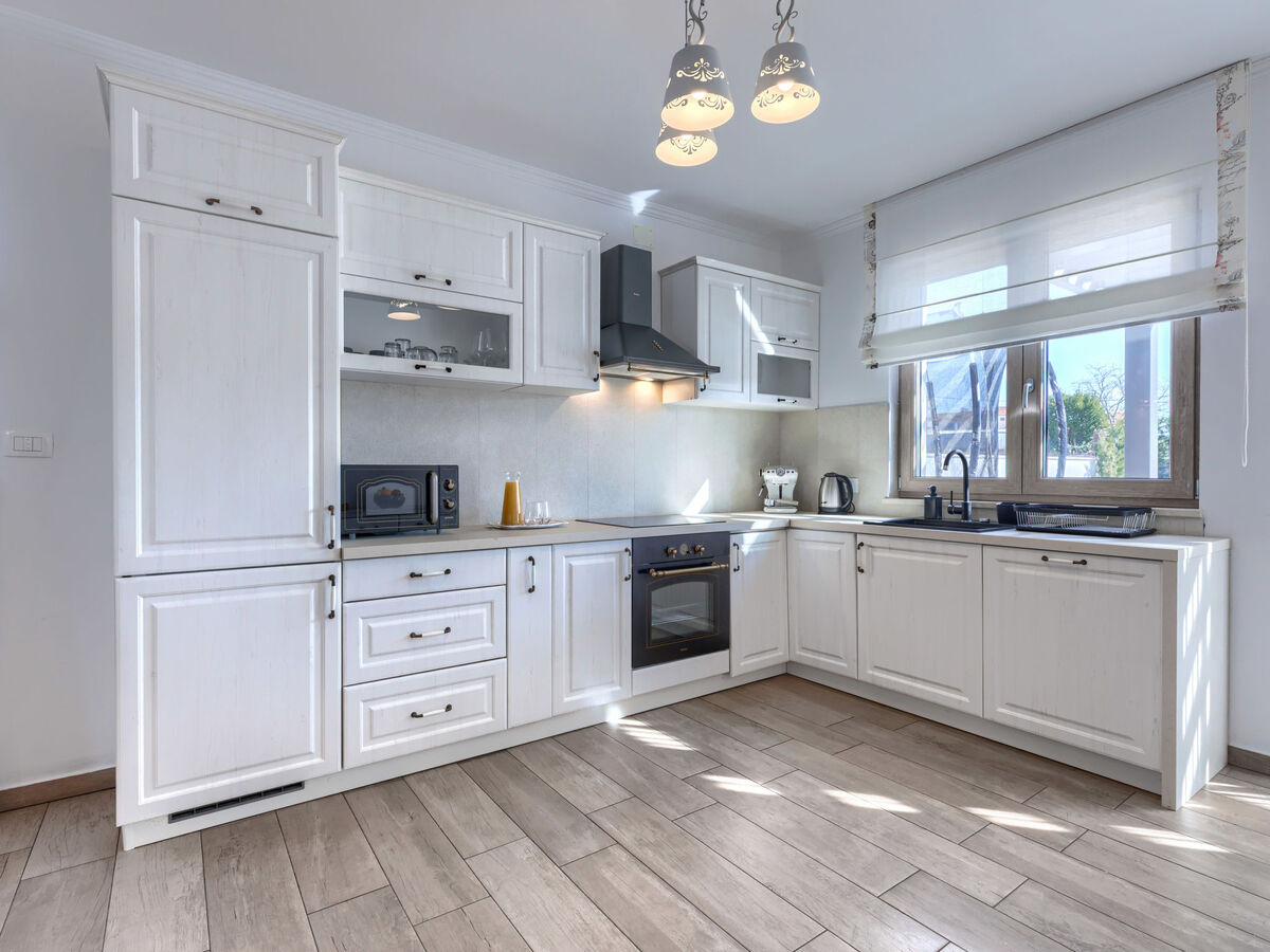 Cuisine ouverte (four, lave-vaisselle, 4 plaques vitrocéramiques, grille-pain, bouilloire électrique, congélateur, cafetière électrique).