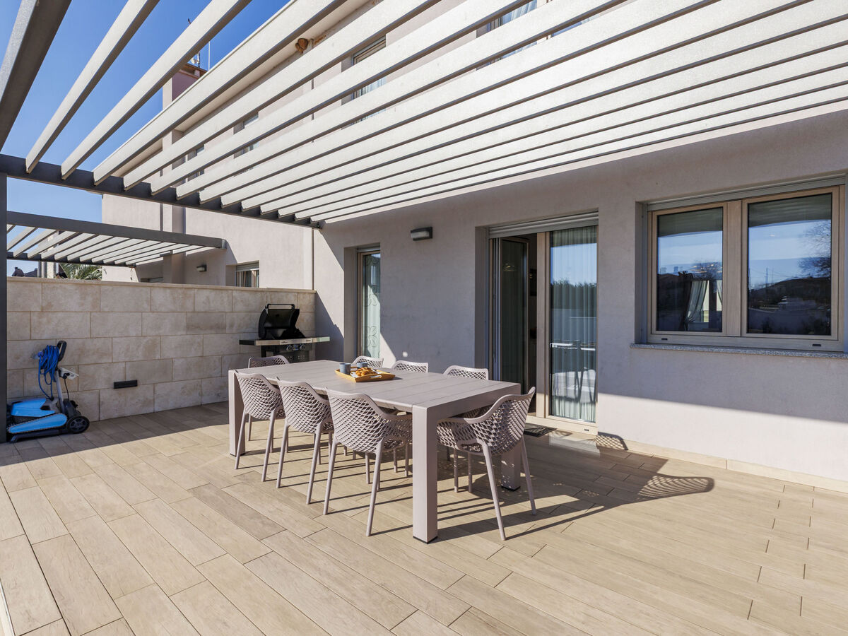 Meubles de terrasse, barbecue (portable), chaises longues.